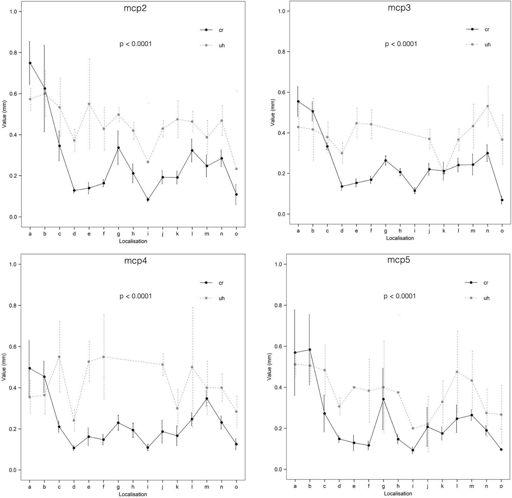 The arteries were injected with Vytaflex 20® (Smooth-On Inc., Macungie, PA, USA) polyurethane colored with So Strong® (Smooth-On Inc., Macungie, PA, USA) red tint. Following a 24-h hardening time at 4°C the hands were placed on −30°C. After the hands were frozen, four blocks each containing one region-of-interest (MCP 2–5) were cut out using a band saw. The blocks extended from the middle of the proximal phalanx of the 3rd finger distally to the middle of the metacarpal bone of the thumb proximally in the axial plane. All four metacarpal blocks per cadaver were positioned in one plastic container facing palmar side down, then embedded in porcine gelatin (G2500-500G, gel strength 300, Type A) (SIGMA-ALDRICH Chemie GmbH, Steinheim, Germany) and were kept on −80°C after the gelatin hardened. Cryosectioning was carried out with the plastic container attached to a CNC milling machine (NCT Kondia 640B, NCT, Budapest, Hungary; rotational speed 3,000 rpm, cutter diameter 200 mm, feed rate 800 mm per revolution). The layer thickness of milling was 50 μm. At every milling step the fresh surface was photographed with a Canon EOS 5DS camera at 8,688 × 5,792 pixels resolution per image. Images were then processed using Adobe Photoshop CS31 and Thermo Fisher Scientific Amira for Life Sciences 6.1 software.2 Since the subsequent image segmentation step in Amira required a 8-bit grayscale volume, we used a Photoshop algorithm to convert the RGB (Red Green Blue) volume to a grayscale image stack, while maintaining the high contrast of the arteries using a selective red color channel subtraction. The grayscale images were then imported into Amira. Possible minor image dislocations were corrected with the “Align Slices” module. Subsequently, using the “Segment Editor” panel of the “Edit New Label Field” module, semi-automatic segmentation was performed to model the arteries. Measurements were taken at predefined locations detailed by the results (section “Measurements on cryosectioned specimens”). The applied technique of cryosectioning, including the steps of image processing and segmentation of the vessels is described in an earlier publication by our group (22).