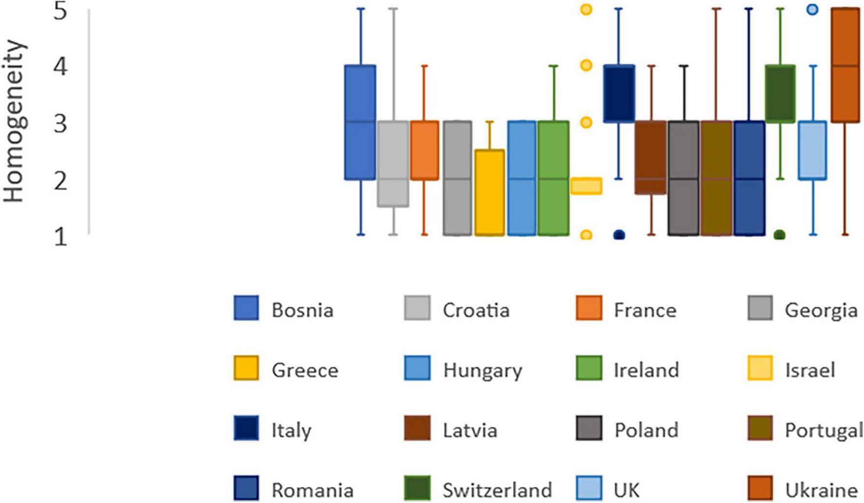 The psychometric properties of the questionnaire were assessed both quantitatively and qualitatively, focusing on validity as a theoretical construct and as an empirical construct. Regarding validity as a theoretical construct, face validity and content validity were tested. During the development of the questionnaire, face validity, i.e., whether the questionnaire measures at first glance what it purports to measure, and content validity, i.e., whether the items adequately represent the entire domain that the questionnaire attempts to measure, were tested. In each case, this was done by EGPRN Primary health care experts, all international authorities in the field of health care. Construct validity, i.e., the extent to which the items in the instrument relate to a relevant theoretical construct, was improved by using the results in the first step of the development process. Given that full randomization was not possible in all countries, a sampling bias may exist, which might have affected external validity. Some strategies were implemented to minimize the potential biases encompassed by conducting multicenter surveys. Each partner undertook the translation (and back-translation) and cultural adaptation of the questionnaire first, and then after resolving terminology issues, the collaborators reached the harmonized version of the questionnaire, with consideration of local arrangements and definitions. This rigorous development of the questionnaire is a strength of the study.