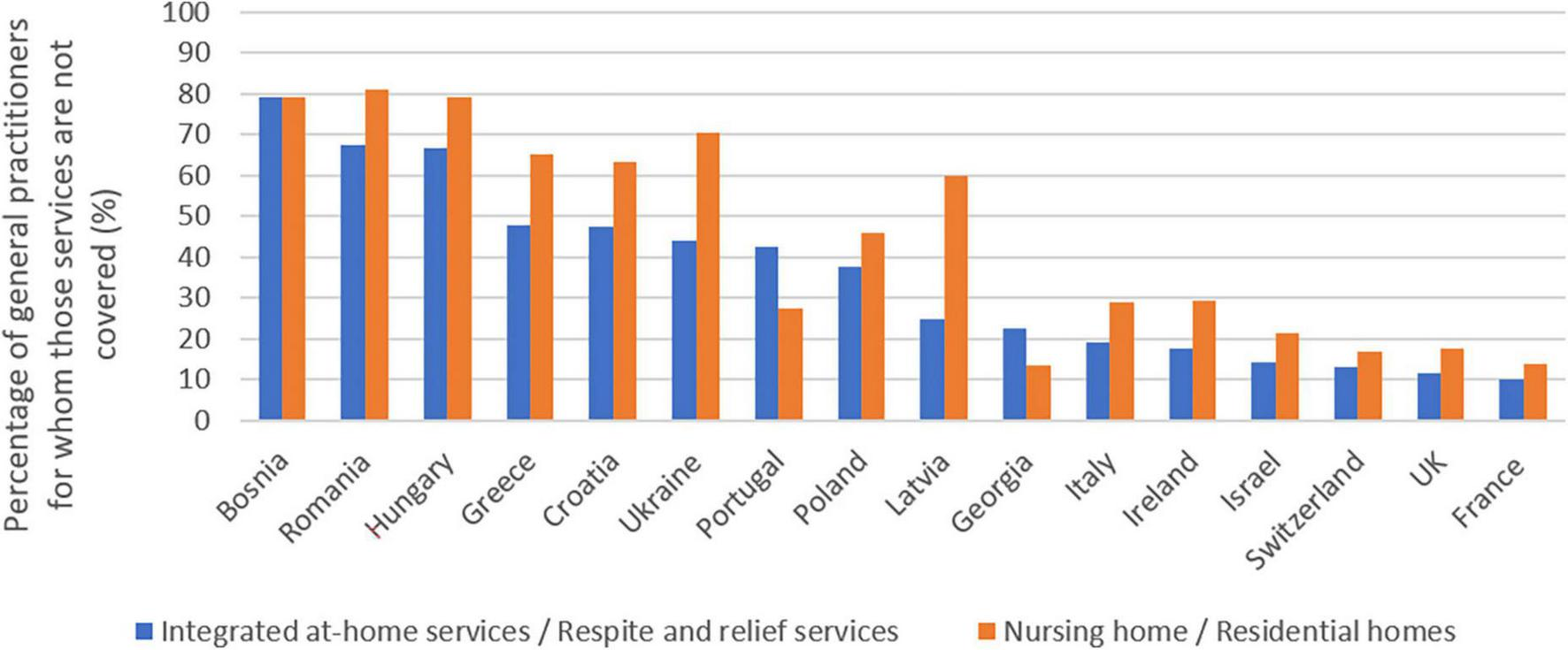 Key informant survey was sent to GPs via a self-developed questionnaire with space for open ended comments. 16 European countries participated to this cross-sectional mixed method study. Given the volunteer nature of the study, no minimum sample size requirements were applied to participation. Convenience sampling technique was used to address variations due to regional variations and regulations within the same country. Descriptive analyses of all intermediate care facilities groups by countries were performed. Qualitative analyses approach was used for the optional-free text to exemplify and/or complete the reasons contained in the closed response categories.