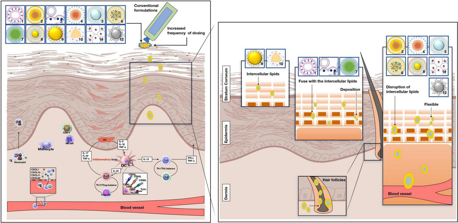 Therefore, recent research has attempted to design and develop a novel drug delivery system to compensate for the deficiencies of traditional drug delivery systems. The nanotechnology-based delivery systems have shown great advantages in increasing drug concentration at the targeted site, drug encapsulation efficiency, and skin penetration, thereby providing better efficiency, reduced side effects, and improved patient compliance. This review examines the various challenges in treating psoriasis, contemporary research into new drug delivery systems, and future potential for therapy.
