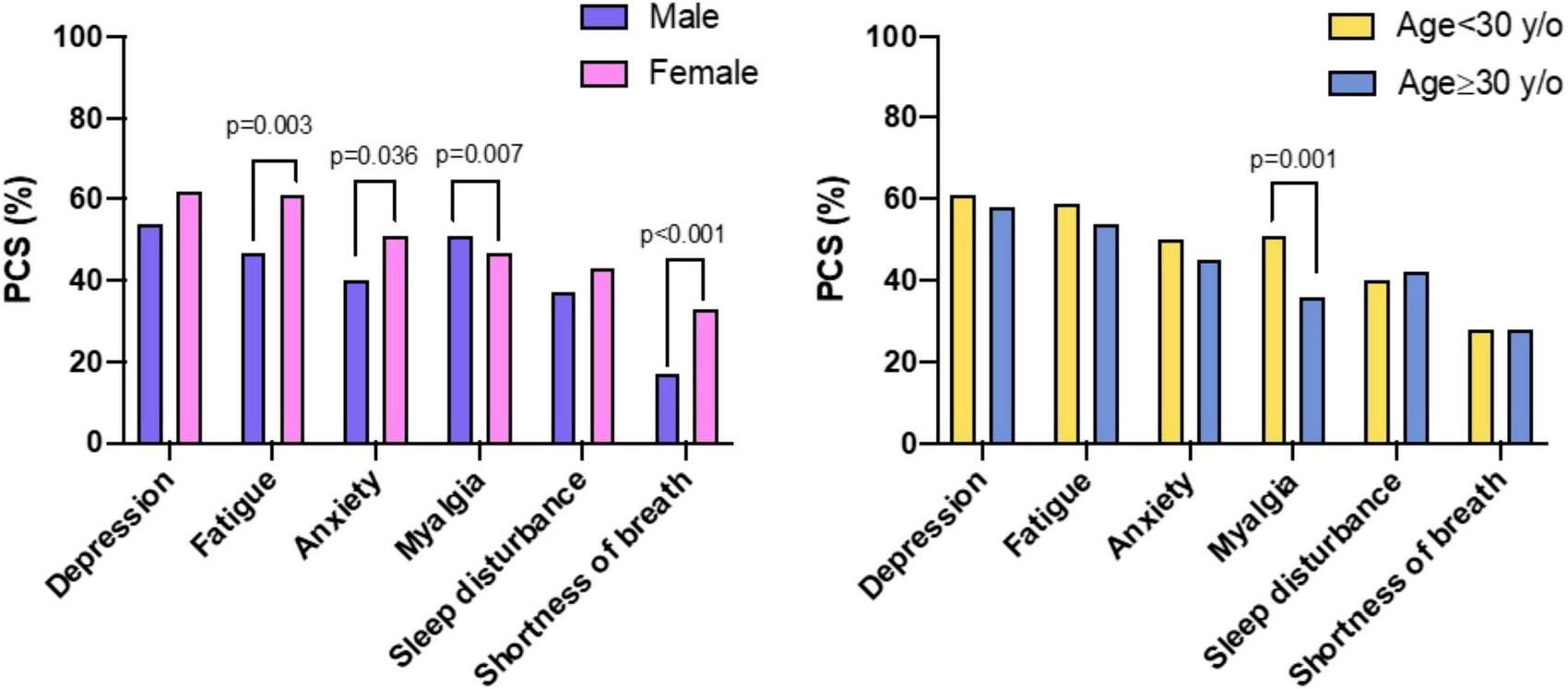 The prevalence of PCS symptoms according to gender and age is reported in Table 1. Gender: Female reported more PCS symptoms in comparison with male [fatigue (61 vs. 47%, p = 0.003), anxiety (51 vs. 40%, p = 0.036), palpitation (40 vs. 30%, p = 0.018), residual symptoms (38 vs. 13%, p = 0.002), weakness (36 vs. 24%, p = 0.004), shortness of breath (33% vs. 17, p < 0.001), and change in smelling sensation (50 vs. 30%, p < 0.001)]. Only myalgia was significantly more frequently reported in male than female (51 vs. 47%, p = 0.007). Age: No significant differences were found in prevalence of PCS between subjects aged < 30 years/old and ≥ 30 years/old, except for myalgia and weakness which were more frequent in subjects aged < 30 years/old in comparison with those aged ≥ 30 years/old [(51 vs. 36%, p = 0.001) and (38 vs. 29%, p = 0.041), respectively].