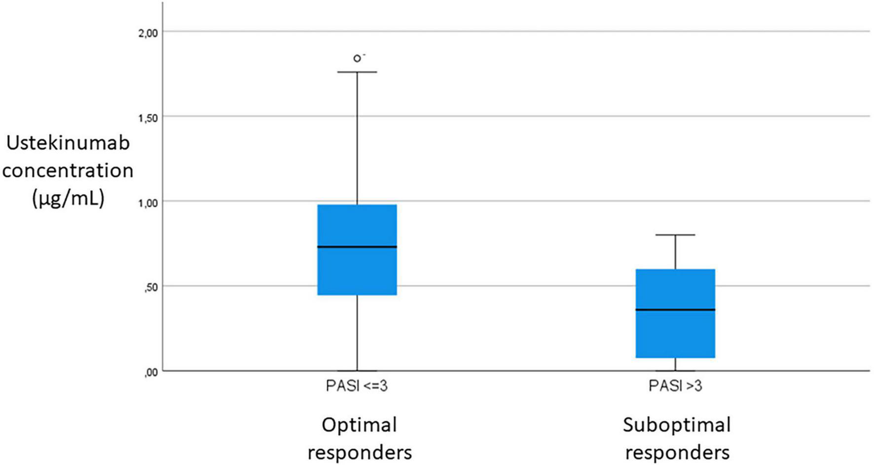 Comparison of ustekinumab concentration between optimal (PASI ≤ 3) and suboptimal (PASI > 3) responders.