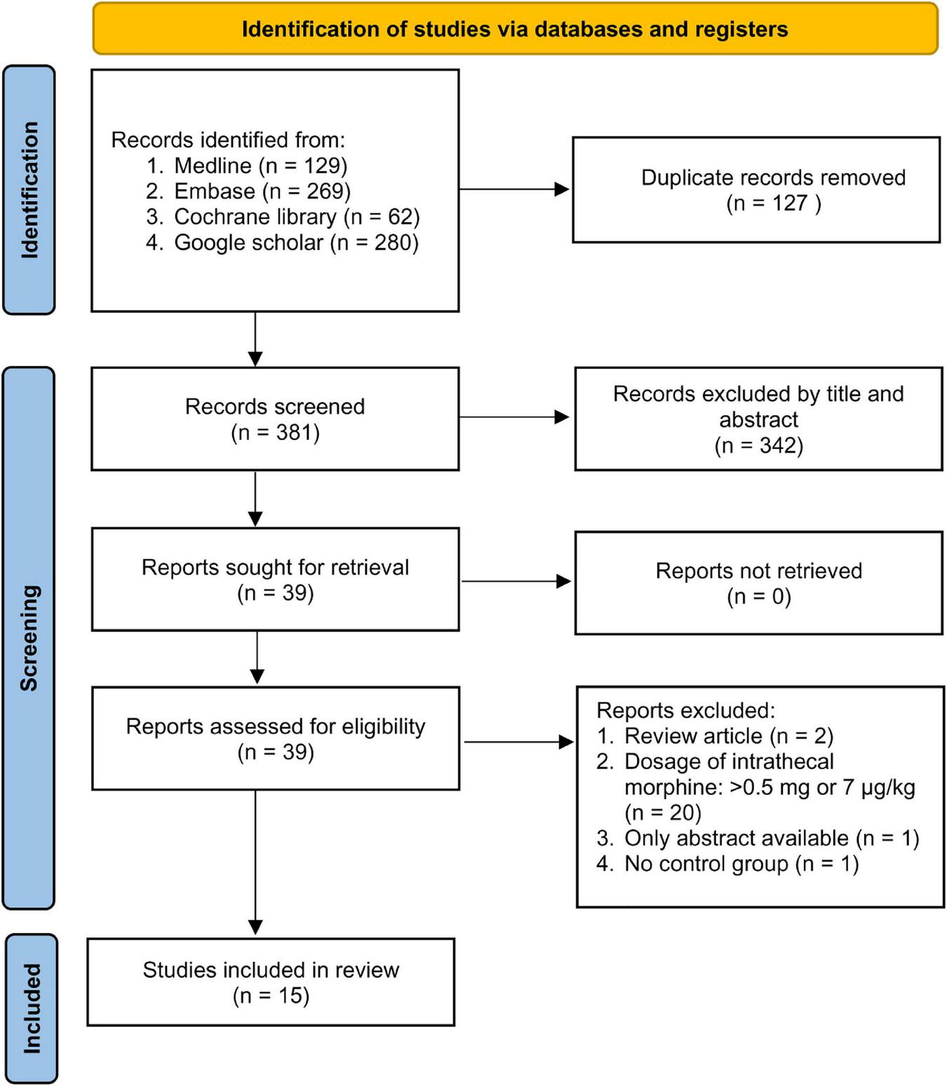 We searched the Cochrane Library, Embase, Google scholar, and Medline databases from inception to February 11, 2022 using the following search terms: [“coronary artery bypass surger*” or “cardiopulmonary bypass surger*” or “cardiovascular surger*” or “cardiac surger*” or “CABG” or “off-pump coronary artery surger*” or “coronary artery bypass graft surger*” or “Heart Surger*” or “Cardiac Surgical Procedure*” or “(Aortic or Mitral or Heart Valve Prosthesis Implantation or Aortic Valve or Mitral Valve) adj4 (procedure* or operation* or surger*)”] and [(“Spinal” or “intraspinal” or “intradural” or “lumbar*” or “theca*” or “intrathecal” or “subarachnoid*” or “sub arachnoid*” or “regional”) adj4 (puncture* or inject* or anesth* or anaesth* or needle*)] limited to randomized controlled trials (RCTs). No restriction was placed on gender, language, study location, and sample size during literature search. The search strategies for one of these databases are demonstrated in Supplementary Table 1. Additional records identified by scrutinizing the reference lists of the retrieved studies were also reviewed for eligibility of being included in the current study.