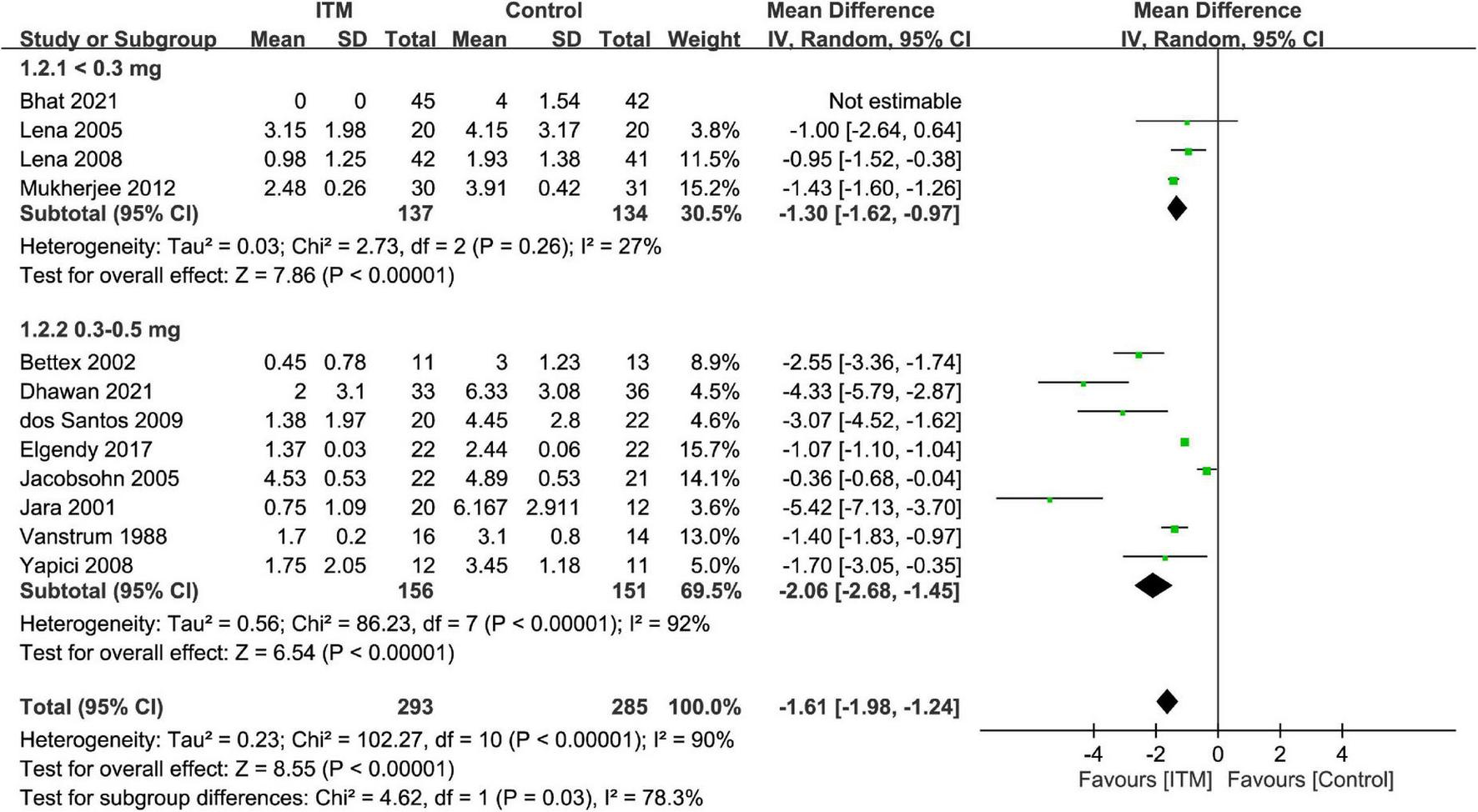 By adopting a random-effects model, ITM was associated with a lower pain score compared to that in the control group at postoperative 24 h (MD = −1.61, 95% CI: −1.98 to −1.24, p < 0.00001, I2 = 90%, 11 trials, 578 participants) (Figure 3). There were similar findings at postoperative 12 h (MD = −2.1, 95% CI: −2.83 to −1.36, p < 0.00001, I2 = 96%, 10 trials, 517 participants) and 48 h (MD = −1.88, 95% CI: −2.83 to −0.93, p = 0.0001, I2 = 80%, 4 trials, 259 participants). Subgroup analysis demonstrated a superior analgesic efficacy associated with a dosage of 0.3–0.5 mg compared to that with <0.3 mg (p = 0.03) at postoperative 24 h, but not at 12 or 48 h (Supplementary Figures 1, 2).