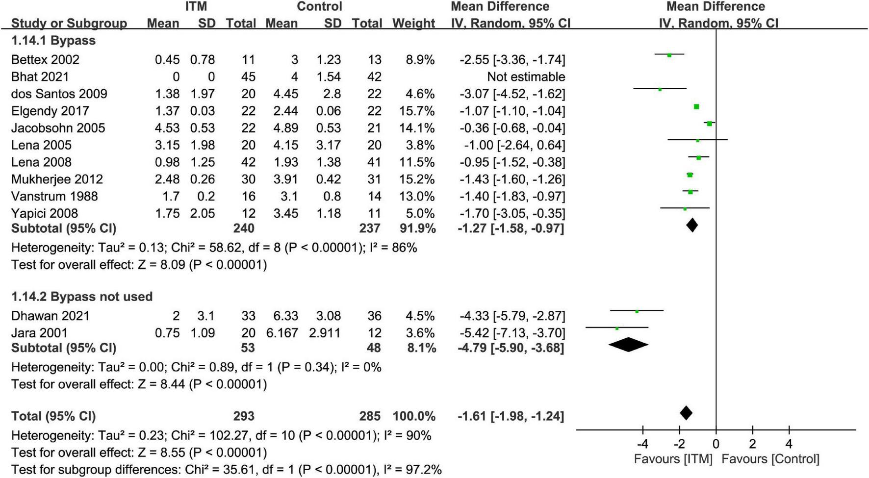 Subgroup analysis comparing postoperative 24-h pain score between intrathecal morphine (ITM) and control groups based on the use of cardiopulmonary bypass. CI, confidence interval; IV, inverse variance; SD, standard deviation.