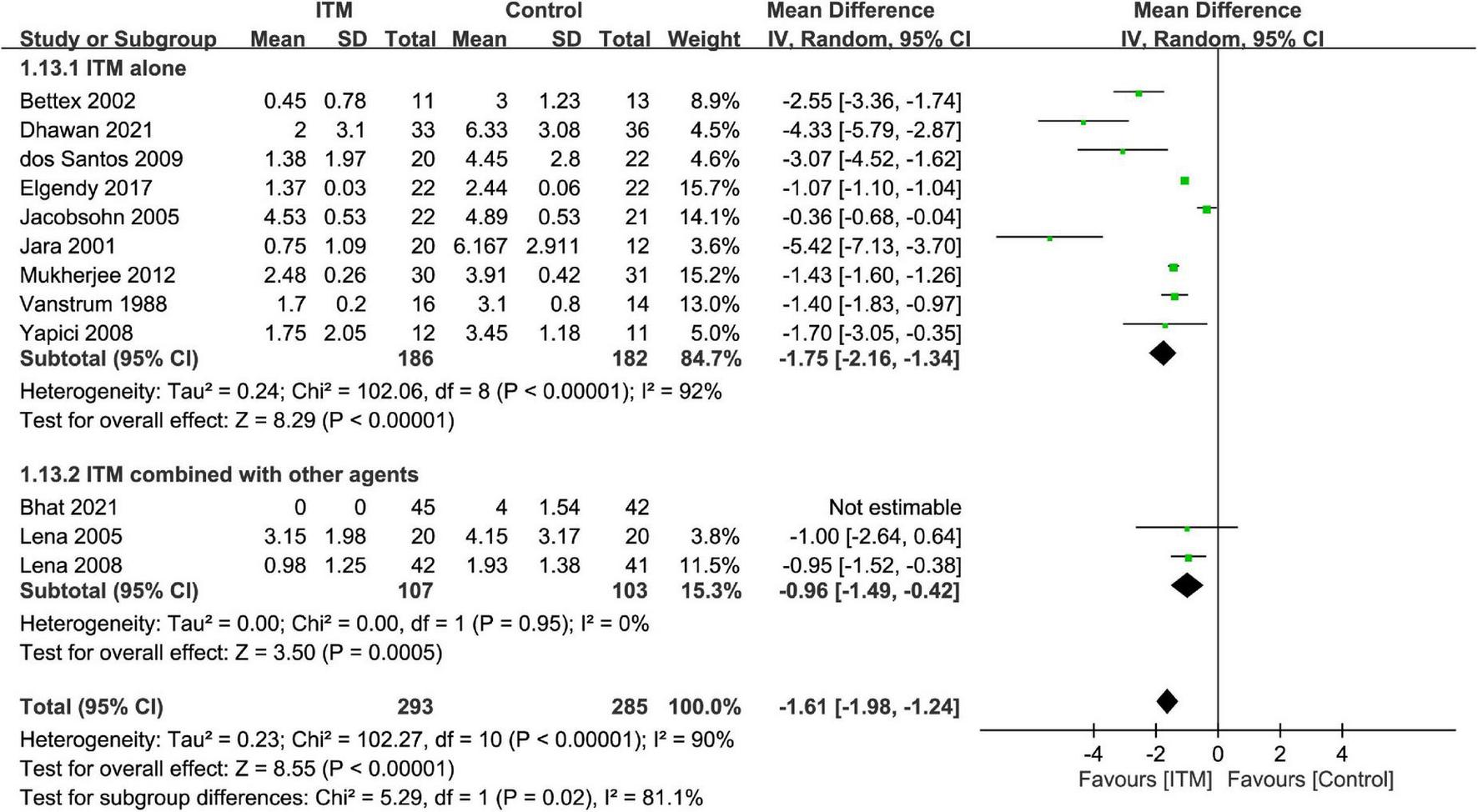Our results showed no significant beneficial effect of using ITM on shortening ICU LOS (MD = −5.69 h, 95% CI: −11.83 to 0.46, p = 0.07, I2 = 87%, four trials, 158 participants) (Supplementary Figure 4) or hospital LOS (MD = −0.53 days, 95% CI: −1.16 to 0.1, p = 0.1, I2 = 0, four trials, 178 participants) (Supplementary Figure 5). Subgroup analysis also demonstrated no dose-related impact of ITM on hospital/ICU LOS.