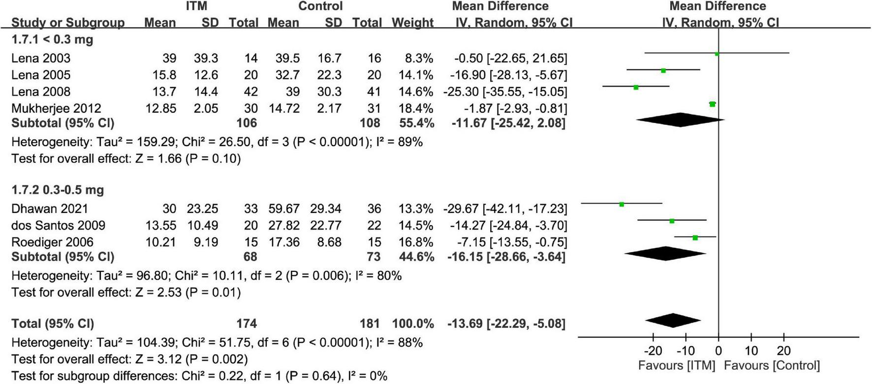 Forest plot showed a lower intravenous morphine consumption in the ITM groups than that in the control groups at postoperative 24 h (MD = −13.69, 95% CI: −22.29 to −5.08, p = 0.002; I2 = 88%, 355 participants) (Figure 7) and 48 h (MD = −14.57, 95% CI: −26.98 to −2.17, p = 0.02; I2 = 98%, 289 participants) (Supplementary Figure 3). There were no subgroup differences between the doses of 0.3–0.5 mg and <0.3 mg at these two time points.