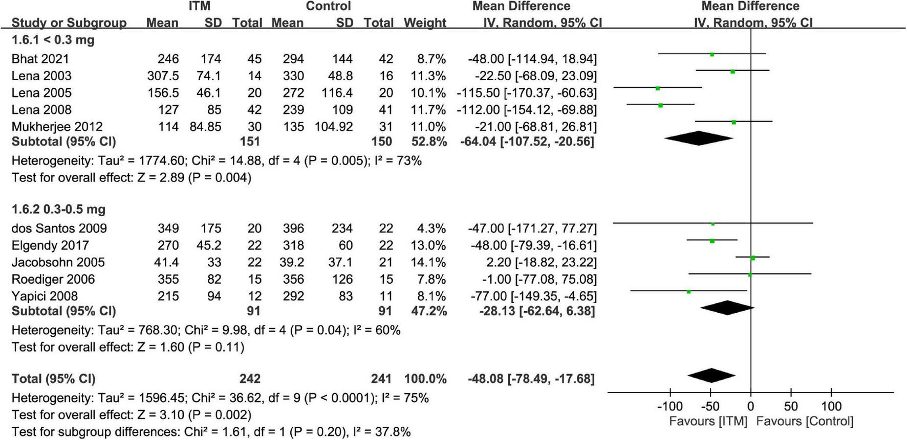 The extubation time was 41.4–355 and 39.2–396 min in the ITM and control groups, respectively. Merged results demonstrated a shorter time for tracheal extubation in the ITM group than that in the control group (MD = −48.08 min, 95%: −78.49 to −17.68, p = 0.002, I2 = 75%, 10 trials, 483 participants) (Figure 8). Subgroup analysis revealed no impact of ITM dosage on extubation time (p = 0.2).