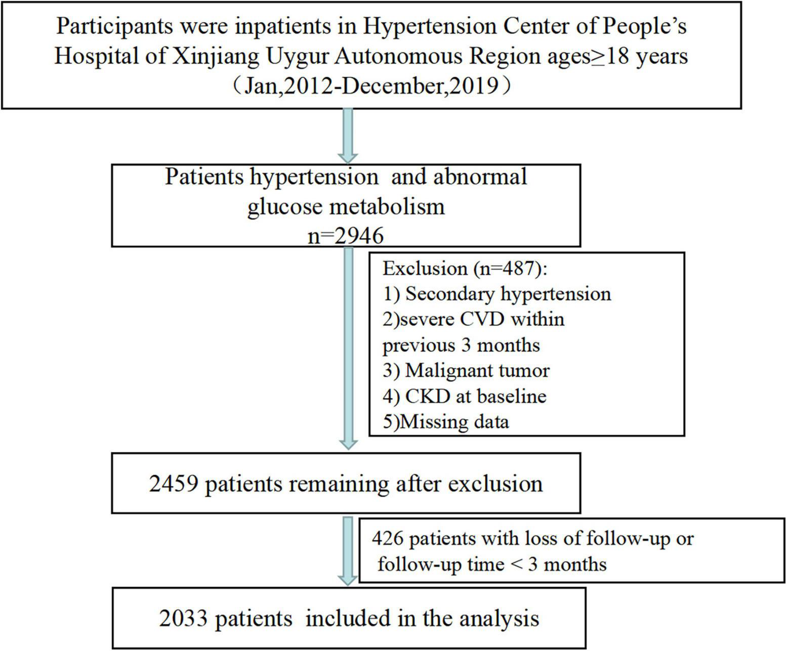 Participants were inpatients from Hypertension Center of People’s Hospital of Xinjiang Uygur Autonomous Region in this retrospective study. The study design have been reported elsewhere (17, 18). In brief, a total of 2,946 participants aged ≥ 18 years who diagnosed with hypertension and abnormal glucose metabolism between January 2012 and May 2019, were identified. Individuals diagnosed secondary hypertension, history of CVD within last 3 months (including acute coronary syndrome, coronary revascularization, and coronary bypass operation, heart failure and acute cerebrovascular disease), or malignant tumor, or with CKD at baseline (n = 410), or missing baseline data (n = 77) were excluded. Finally, we collected the outcome data for 2,459 patients (Figure 1).
