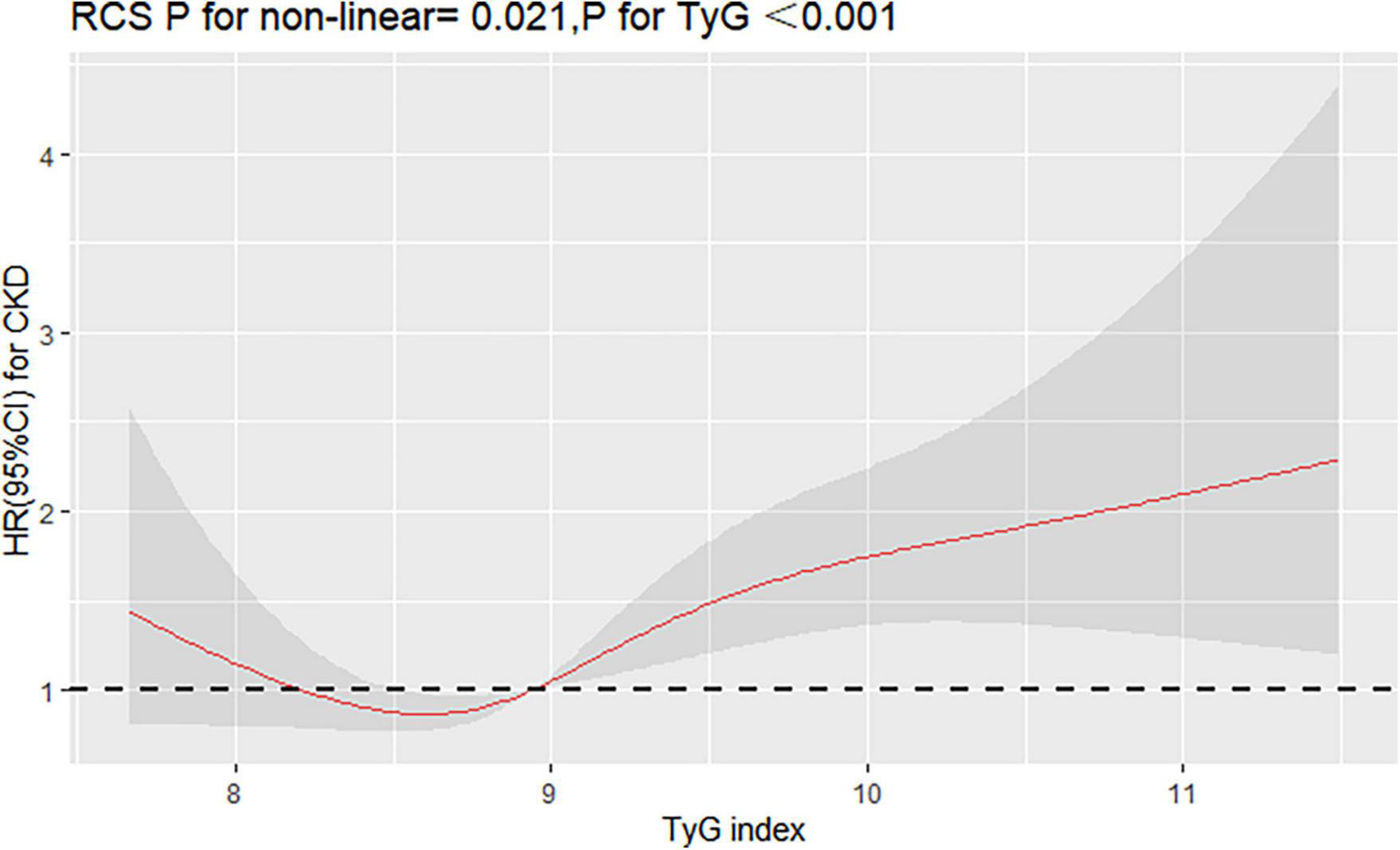 Figure 3. Restricted cubic splines (RCS) for the shape of the association of TyG with CKD. It was used a multivariate Cox regression model of restricted cubic spline with 4 knots (at the 5th, 35th, 65th, and 95th percentiles) of TyG adjusting for potential covariates (including sex, age, smoke, drink, BMI, duration of hypertension, duration of diabetes, SBP, DBP, LDL-C, HDL-C, Cr, BUN, UA, lipid-lowering drugs, antidiabetic drugs, and antihypertensive drugs). The reference point for TyG index was 8.94 (the median of TyG).
