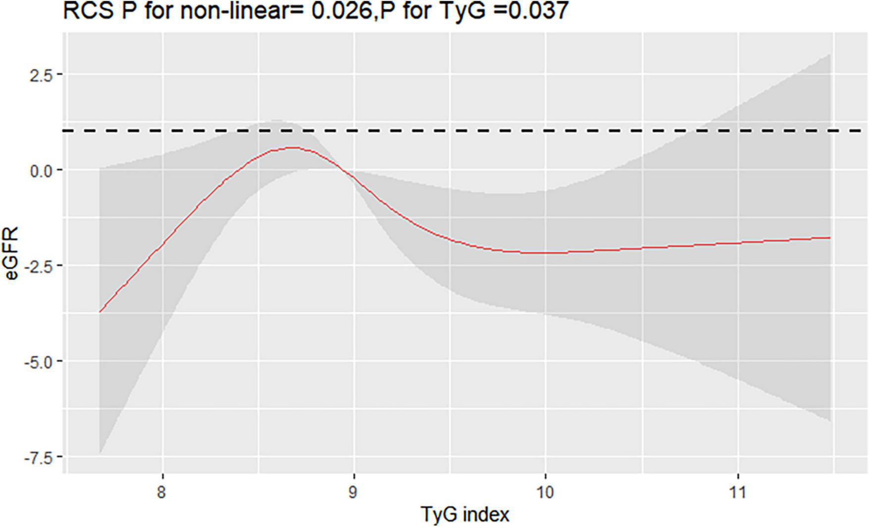 Figure 4. Restricted cubic splines (RCS) for the shape of the association of TyG with eGFR. It was used a multivariate linear regression model of RCS with 4 knots (at the 5th, 35th, 65th, and 95th percentiles) of TyG adjusting for potential covariates (the same as Figure 3). The curve was centered at the median value of 8.94.