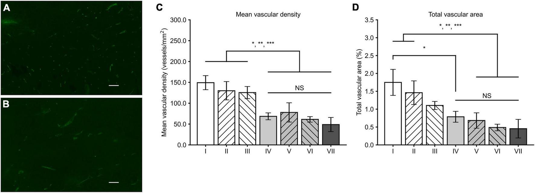 MVD and TVA measured from CD34-positive microvessels (Figure 1) revealed that in general, MVD was lower in all treatment groups (groups IV-VII) when compared to the control groups (groups I-III). The lowest MVD was observed in the group VII (48.9 ± 16.9 / mm2). However, the differences between gene therapy receiving groups remained non-significant. The MVD was significantly lower in the group VII when compared to the groups I (p = 0.001), II (p = 0.008), and III (p = 0.013). TVA data follows the same trend as with the MVD data: the lowest TVA was found in group VII (0.45 ± 0.26%), in comparison to the other groups. The TVA was statistically significantly lower in group VII compared to the groups I (p = 0.006) and II (p = 0.032).
