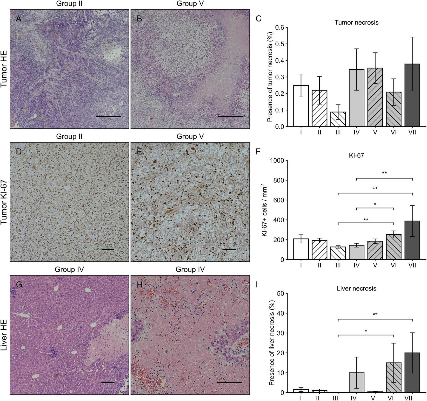 HE and Ki-67 immunohistochemical stainings of tumor and liver. Tumor HE stainings from the group II (A) and VII (B) with magnification 40 × and scale bar of 500 μm. Varying levels of tumor necrosis were observed in all groups without significant differences (C). Tumor Ki67 stainings from the group II (D) and VII (E) with magnification 100 × and scale bar of 100 μm. The number of Ki67 positive cells was highest in the groups VI and VII when compared to the groups III and IV (F). Liver HE stainings from the group IV with magnification 100 × (G) and 200 × (H) with a scale bar of 100 μm. In general, the presence of liver necrosis was higher in all groups receiving sVEGFR2 as a part of the therapy (groups IV, VI, and VII) of which the groups VI and VII showed significant differences when compared to the group III (I). Results were considered statistically significant with values of p < 0.05* and p < 0.01**.