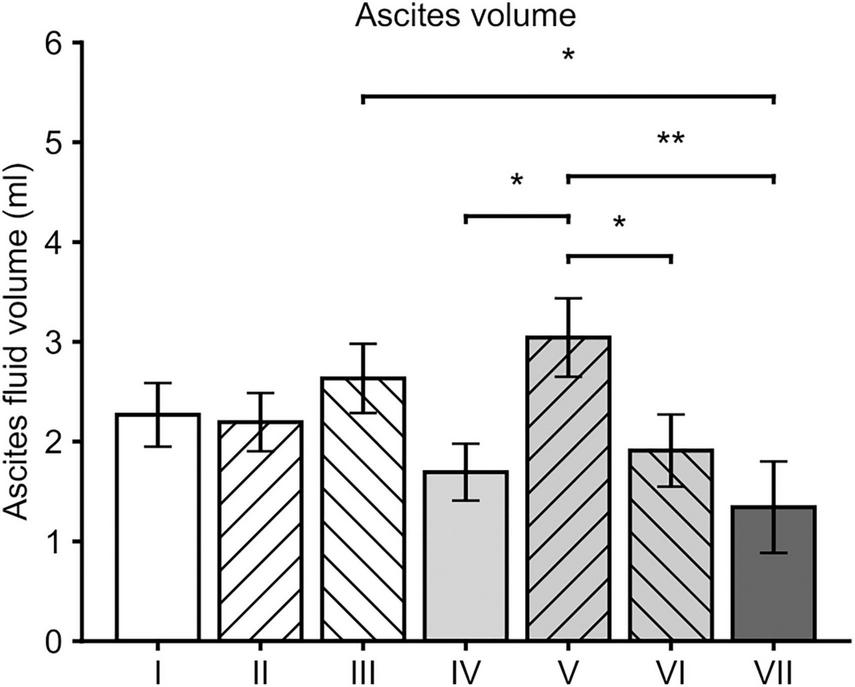 Mean volume of ascites fluid in all groups was 2.16 ± 0.14 mL. Ascites fluid formation was significantly reduced in group VII when compared to the groups III (p = 0.017, Post-hoc LSD) and V (p = 0.003). Significantly reduced amounts of ascites fluid were detected also in the groups IV (p = 0.015) and VI (p = 0.031) when compared to group V (Figure 3).