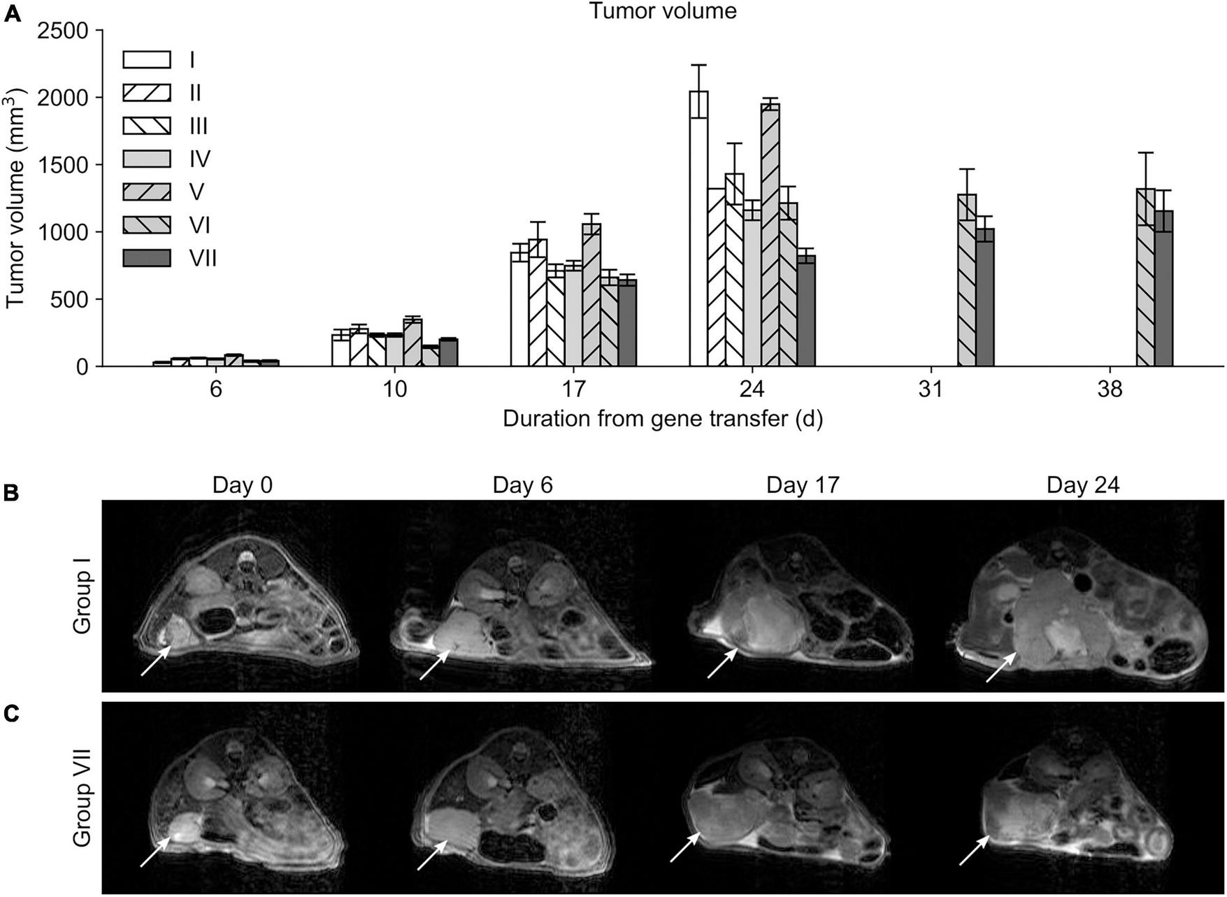 Mean tumor volumes. (A) Differences in tumor volumes were first observed at day 10 only between the groups V and VI. Only mice belonging to the study groups VI and VII survived long enough to be measured at timepoints 31 and 38 days. Serial MRI scans from the group I (B) and VII (C) demonstrating tumor growth during the follow-up. Location of the tumor is indicated with a white arrow.