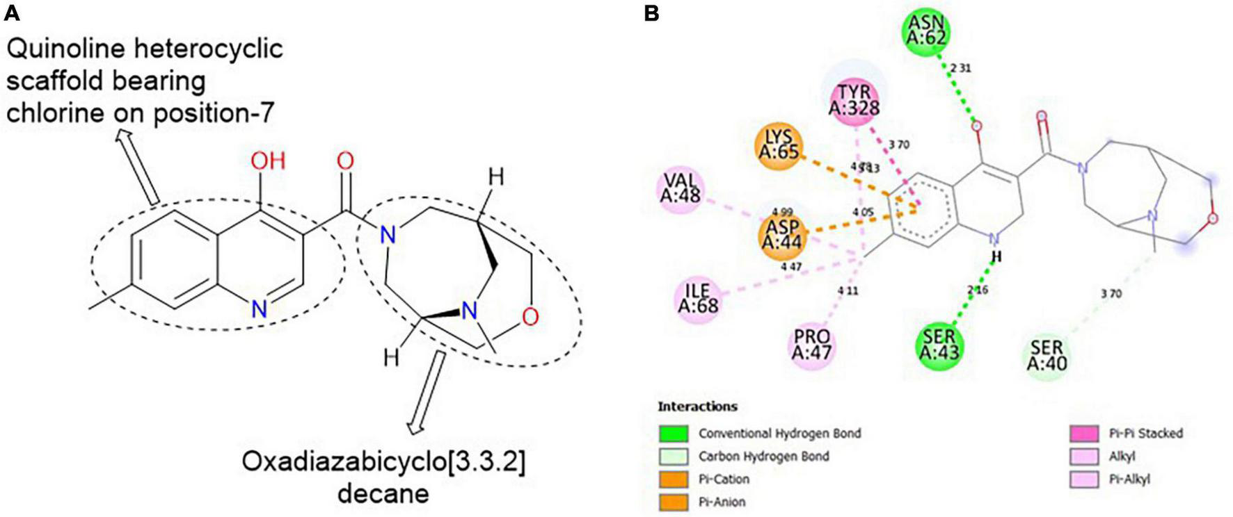Four key properties of ligands in terms of hydrogen bond acceptors, hydrogen bond donors, hydrophobicity, and aromaticity were chosen to construct an effective pharmacophore query for virtual screening. The hit screening parameters were also set based on Lipinski’s rule of five (27): molecular weight ≤ 500, hydrogen bond acceptors ≤ 10, hydrogen bond donors ≤ 5, a logP (octanol-water partition coefficient) value ≤ 5 and Veber’s filter: rotatable bonds ≤ 10, Aromatics ≤ 2 and total polar surface area (TPSA) ≤ 140 Å. The following databases were explored for the pharmacophore-based virtual screening: CHEMBL, ChemDiv, ChemSpace, MCULE, MCULE-ULTIMATE, MolPort, NCI Open Chemical Repository, LabNetwork and ZINC databases.