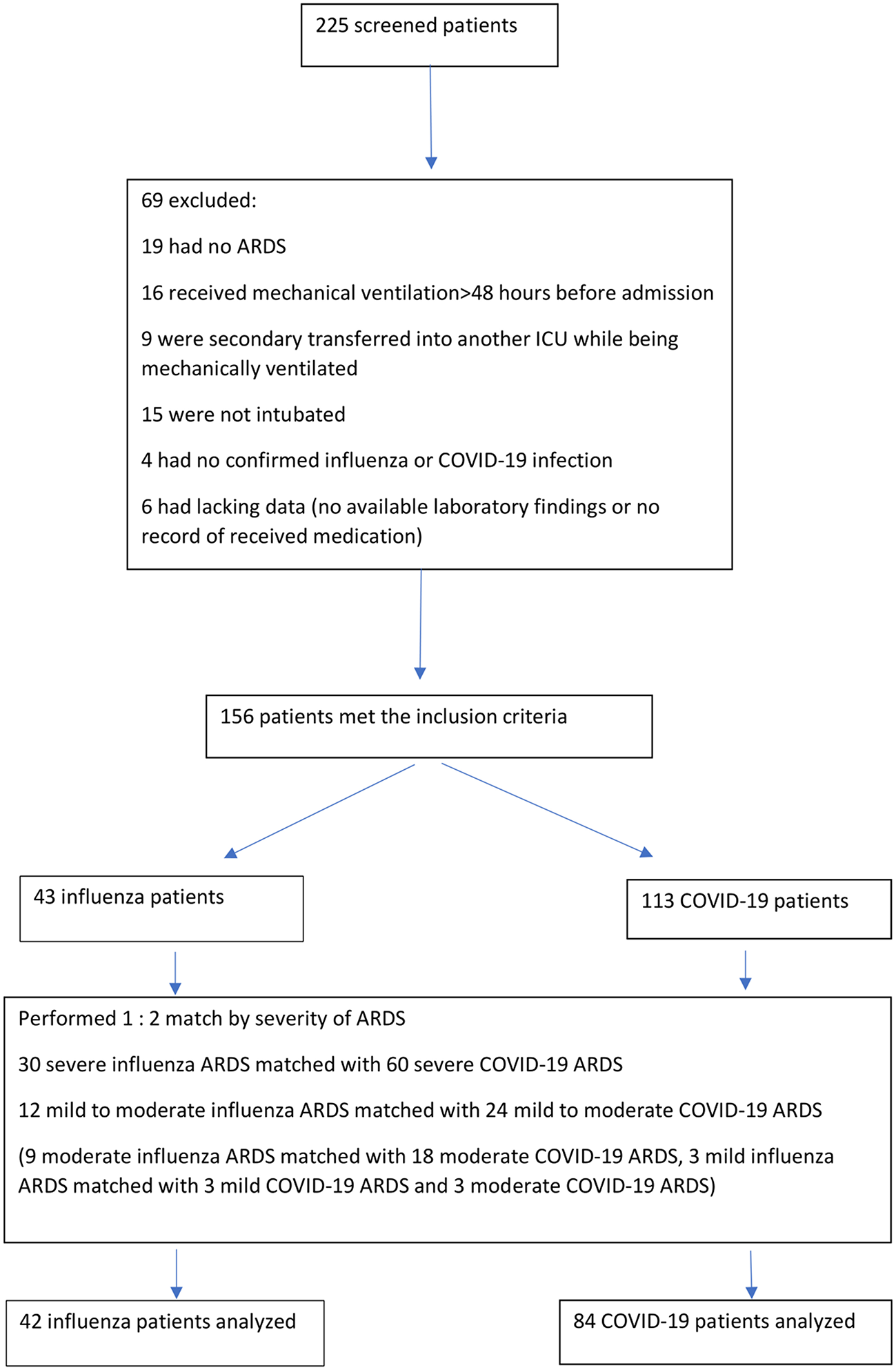 This retrospective, analytic, single-center study was conducted in the medical ICU of Nancy University Hospital in France. Adult patients hospitalized with confirmed influenza (from 2009 to 2019) or SARS-CoV-2-induced ARDS (between March 2020 and May 2021) and those under mechanical ventilation were included. Each patient with influenza was matched with two patients with COVID-19, with the same severity of ARDS. The primary endpoint was death in ICU on day 28. The secondary endpoints were the duration of vasopressors, the use of renal replacement therapy, the duration of mechanical ventilation, and the ICU length of stay.