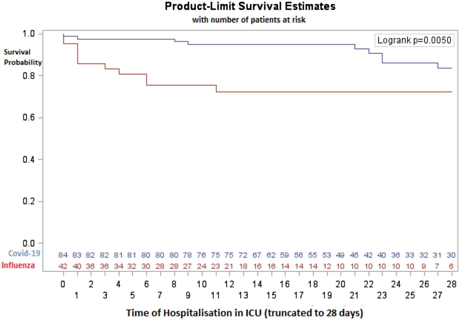 Thus, it could be hypothesized that for an equal severity of ARDS, a greater proportion of patients with influenza has multi-organ failure at admission into the ICU. Indeed, our multivariate model shows that initial arterial pH and SOFA score are independent predictors of mortality in our patients. For example, each decrease of 0.1 points in the initial arterial pH increases the risk of mortality by 61%. In this model, there was no statistical association between the type of virus and mortality, meaning that having influenza or SARS-CoV-2 is not, by itself, a risk factor for mortality. In other words, there would be no difference in terms of mortality between patients with influenza and COVID-19, if their initial severity was similar.