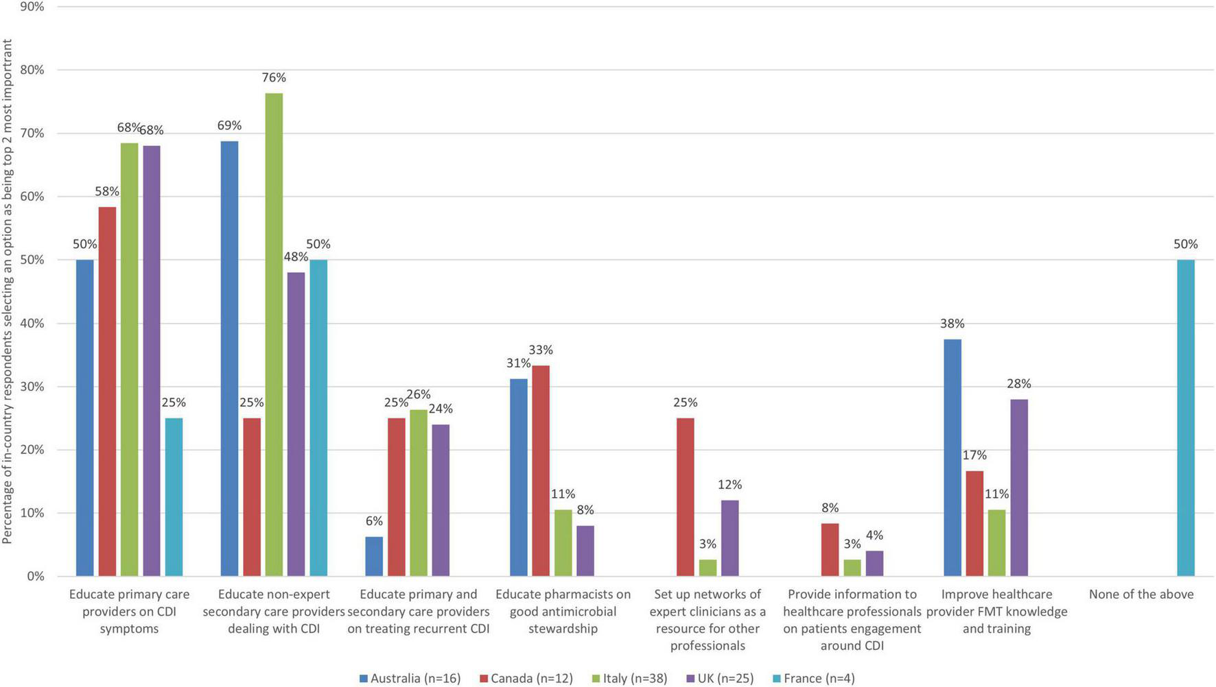 For patients with hospital acquired CDI in Australia, Canada, the UK, and France, the first point of care for patients tends to be the person under whose care they are more generally (81, 75, 80, and 50% of survey respondents, respectively). However, in Italy, this was only seen as the most common route by 40% of survey respondents. More common in Italy was referral to an infectious disease expert (47% of survey respondents), while this option was rarer in France, Australia, the UK, and Canada (25, 19, 16, and 8%, respectively). See Supplementary material for further information.