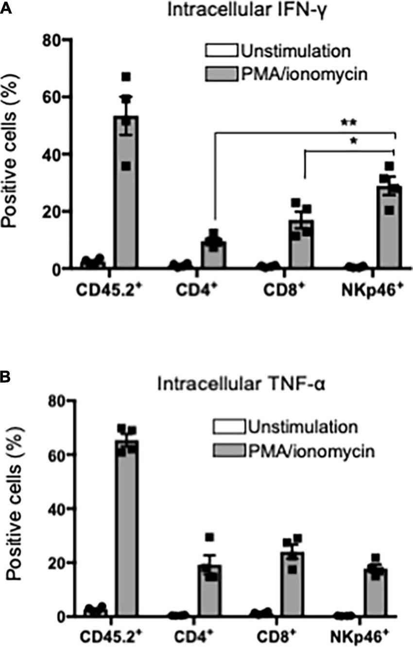 Th1 cells that produce inflammatory cytokines, such as IFN-γ, play a key role in the pathogenesis of pSS (35, 38). Particularly, IFN-γ from SG tissues in patients with pSS and pSS model mice is associated with the activation of T cells, antigen-presenting cells, and epithelial cells (39). When CD45.2+ lymphoid cells within SG tissues, including T cells and NK cells, in pSS model mice were stimulated with phorbol 12-myristate 13-acetate (PMA) for 24 h, IFN-γ production could be detected by flow cytometric analysis with intracellular staining. Surprisingly, the production level of IFN-γ in SG NK cells was significantly higher than that in CD4+ and CD8+ T cells within SG tissues (Figure 5A). In contrast, no difference in the intracellular TNF-α production was found among CD4+, CD8+ T cells, and NK cells in SG tissues in pSS model mice (Figure 5B). These results indicate that SG NK cells can produce abundant IFN-γ in the target organ of pSS.