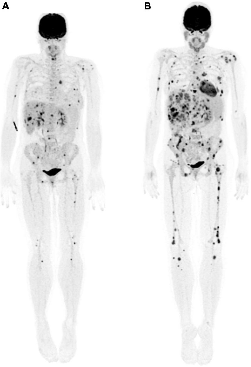 44-year-old woman with presumed stage IIIB melanoma of right buttock. (A) Maximum intensity projection whole body 18F-FDG PET image showed extensive metabolically active metastatic disease in the breasts, liver, and skeleton. (B) Three months following initiation of immunotherapy, follow-up maximum intensity projection whole body 18F-FDG PET image showed interval development of innumerable new liver, skeletal and breast lesions, most with diameter <15 mm, in keeping with progressive disease according to PERCIMT criteria.