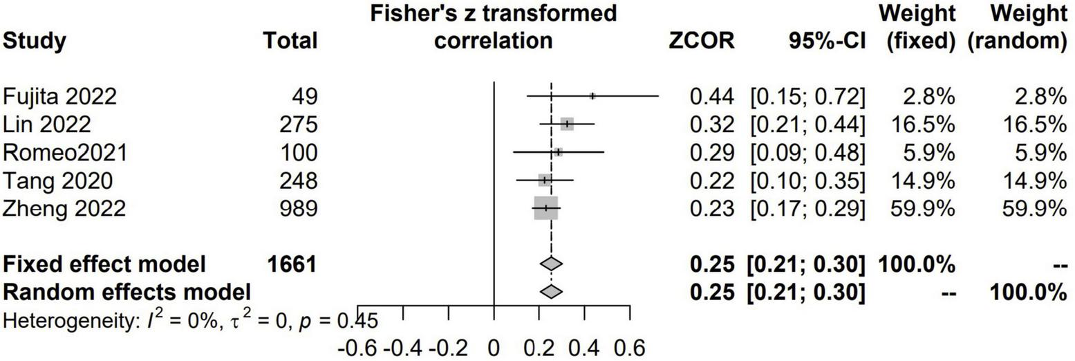 Secondary outcomes included associations between CCR and CTASM evaluation, muscle strength, gait speed, nutrition screening tool, or other clinical outcomes (i.e., duration of mechanical ventilation, length of stay in ICU or hospital, and complications). As to these outcomes, we conducted related meta-analyses individually for the various data reporting types as follows among the included studies. (1) For the studies that provided the correlation coefficient between CCR and predefined outcomes (i.e., CTASM, handgrip strength [HGS], gait speed [GS], and nutrition screening tool), we performed a meta-analysis by quantitatively summarizing the correlation coefficient statistic (r) estimates. Fisher’s Z and its SE were calculated using r and sample size (N) as follows: Zr = (1/2) [loge (1 + r) − loge (1 − r)], SEzr = 1/sqrt[N−3] (27). After appropriate transformation, we used the inverse variance-weighted approach to determine effect sizes and the associated 95% confidence intervals (CI). (2) For the studies reporting the diagnostic value of CCR for detecting sarcopenia, we pooled Area under the curve (AUC) values using the mean and standard error SE values and weighted them using the inverse-variance method (28). (3) We collected and pooled OR with 95% CI via the generalized inverse-variance method for studies that showed an association between CCR and sarcopenia using regression analysis. Unless otherwise noted in the above meta-analyses, we preferred the adjusted analysis results.