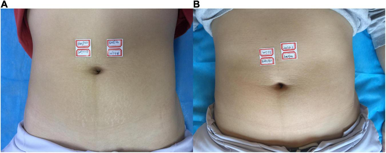 The striae treatment areas were divided into halves using the patients’ umbilicus as the middle line on the abdomen. The left side is treated with 10,600 nm CO2 laser and the laser settings are similar, with 10,600 nm wavelength, 60–75 mJ energy, 1.5-mm point spacing, and 20 mm × 20 mm scanning area. On the right side, a 1,550 nm Er: glass fractional laser treatment was used. The treatment parameters were as follows: DD mode, spot density: 49 spots/cm2, energy density: 60–80 mJ, scanning area: 20 mm × 20 mm. The laser settings used in this study were determined based on our previous experience with these lasers and the therapeutic response of the patients.