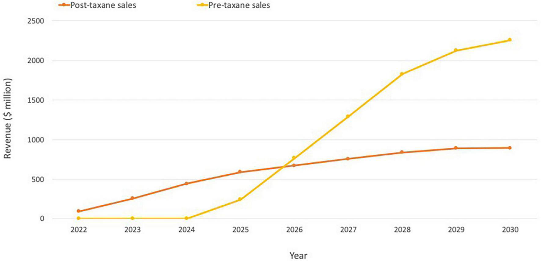 Pluvicto sales projections. Projections include estimates for both pre- and post-taxane markets assuming ∼20% penetration in the US and ∼15% elsewhere. If Pluvicto is approved for the pre-taxane market, it is estimated that this would lead to an additional ∼$2 billion on top of current projections for the post-taxane market. Based on estimates from (51).