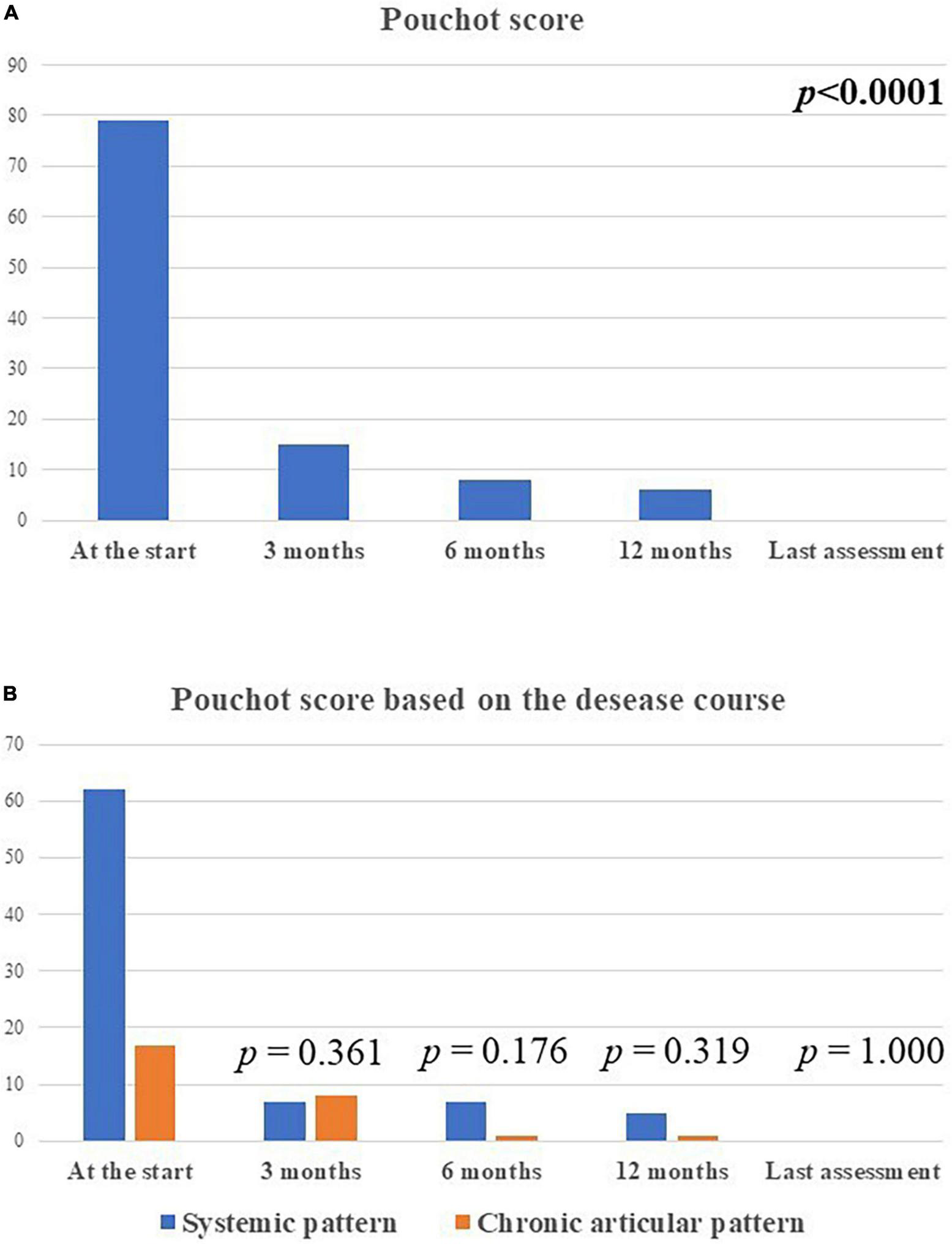 The total amount of the modified Pouchot score in the whole group of patients enrolled (A) and according with the disease course (B) at the different time-points. The total amount of the systemic modified Pouchot score was higher among patients with the systemic Still’s disease in relation with the higher systemic involvement in this patients compared to the chronic-articular type.