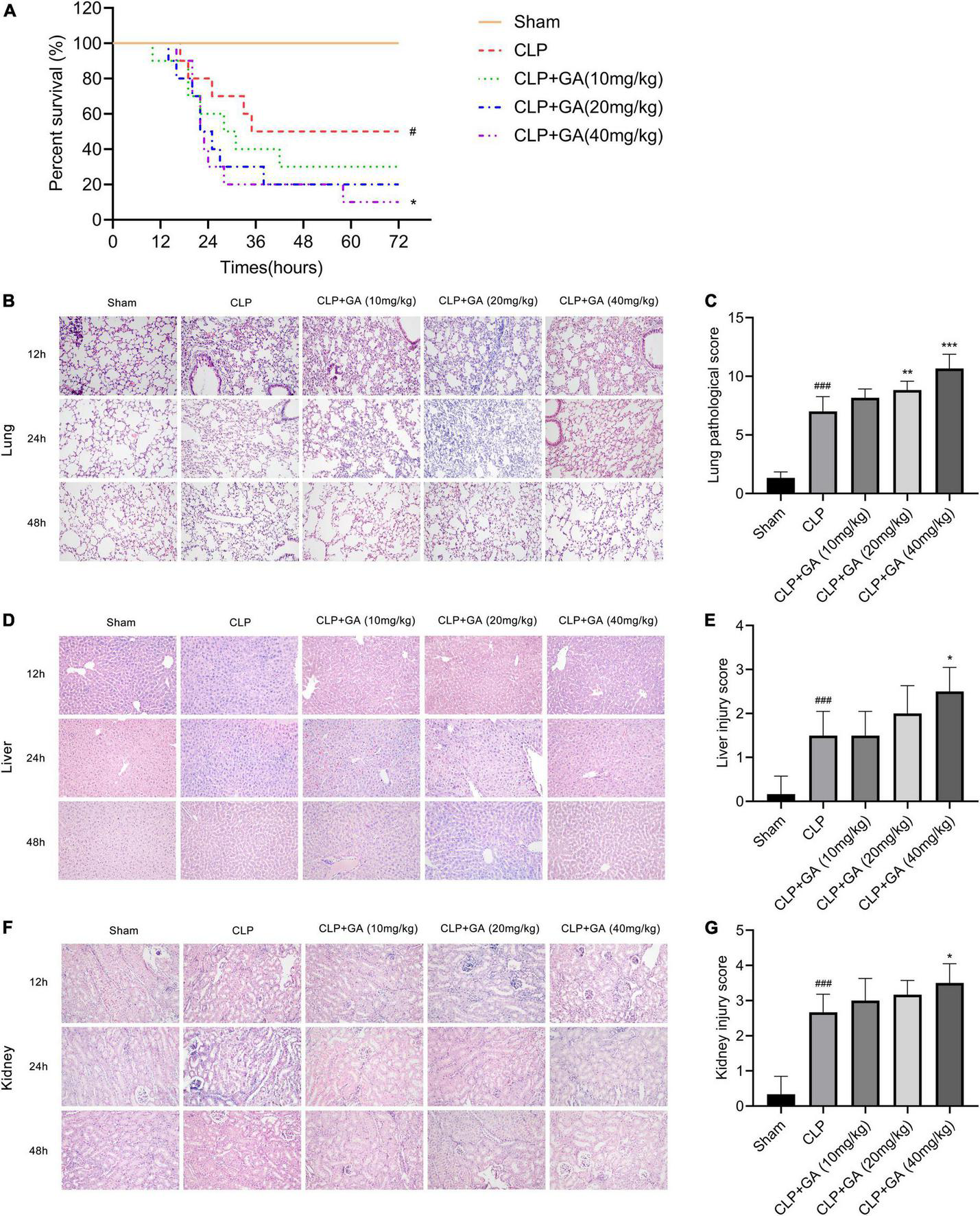 Relative to that in the sham group, the 72-h survival rate was markedly reduced in the CLP group, but was further decreased in the GA-treated mice (Figure 2A). Next, the effect of GA on the lung, liver and kidney was assessed by H&E staining during 12, 24, and 48 h of CLP-induced sepsis. Compared to the CLP group, the CLP + GA group exhibited more severe neutrophil migration and infiltration, hemorrhage, alveolar cavity congestion, and interstitial lung edema in a dose-dependent manner (Figures 2B, C). Meanwhile, the liver cell borders were blunted received with GA. The markedly severe edema, inflammatory cell infiltration and hepatocyte necrosis were observed (Figures 2D, E). Further, the mice with GA treatment exhibited more severe renal tubular damage (Figures 2F, G). These indicate that GA exacerbates pathological organ changes in septic mice.