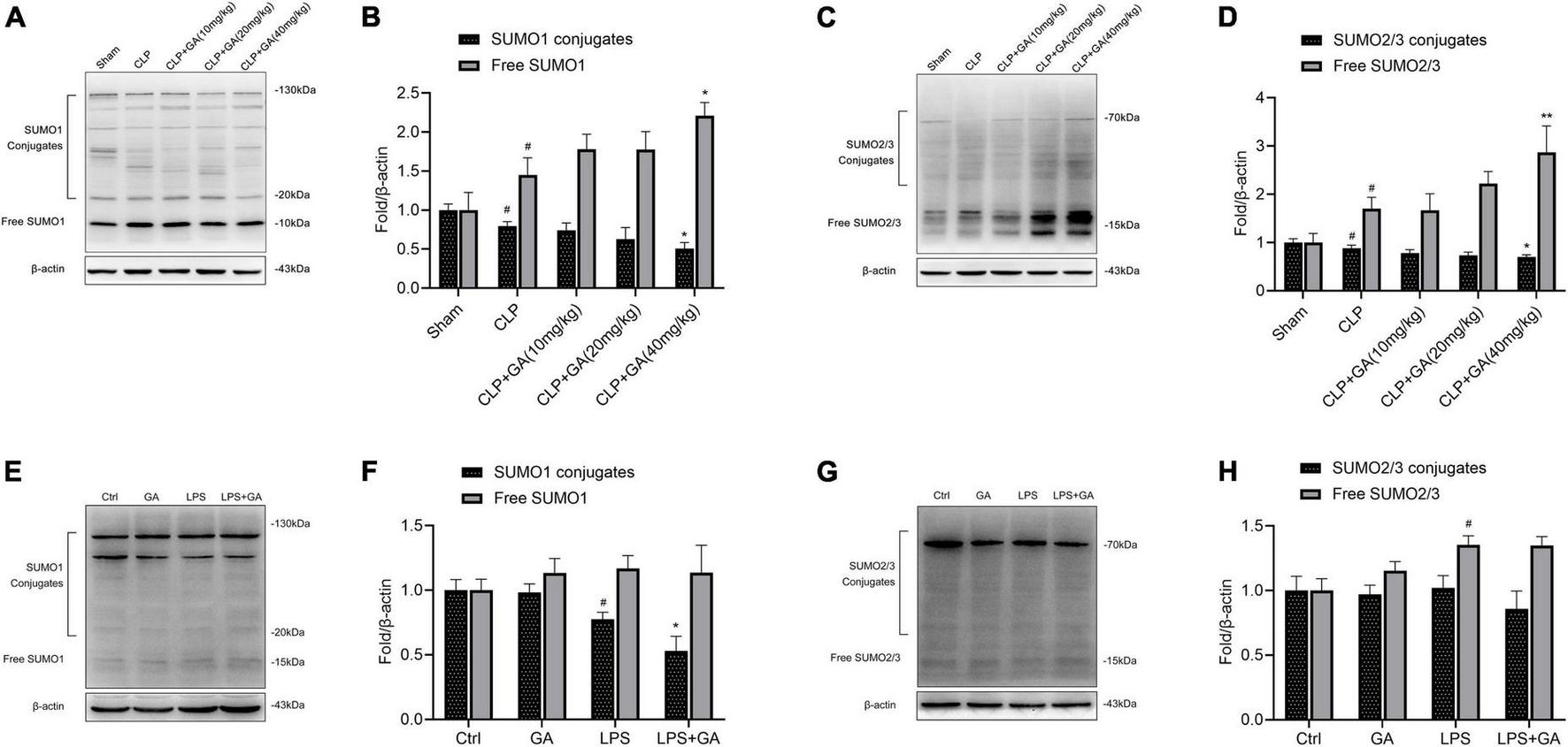The result showed that GA promoted inflammatory responses, reduced bacterial clearance, aggravated organ damage, and increased mortality in septic mice. GA increased apoptosis in peritoneal macrophages (PMs) and RAW 264.7 cells. Meanwhile, GA inhibited SUMOylation and increased the nuclear translocation of NF-κB p65 as well as its phosphorylation level.