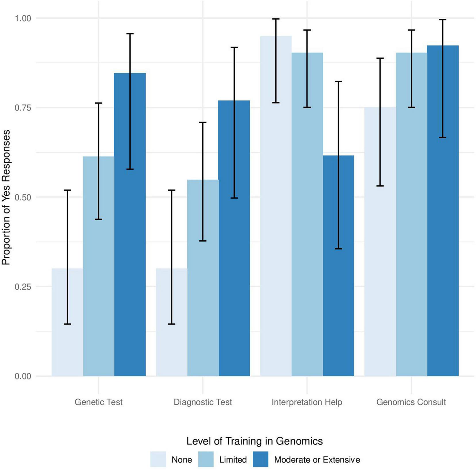 Figure 1. Level of genomics training influences use of genetics testing in clinical settings. Proportion of providers who responded Yes to the questions, “Have you ever ordered a genetic test for one of your patients?,” “Have you ever ordered a genetic-based test for diagnostic purposes?,” “Do you feel you need help interpreting clinical genomic data if these data was made available to you?,” and “Would you place a consult to a physician with expertise in genomic medicine if available at your institution” arranged from left to right stratified by self-reported level of training in genomics.