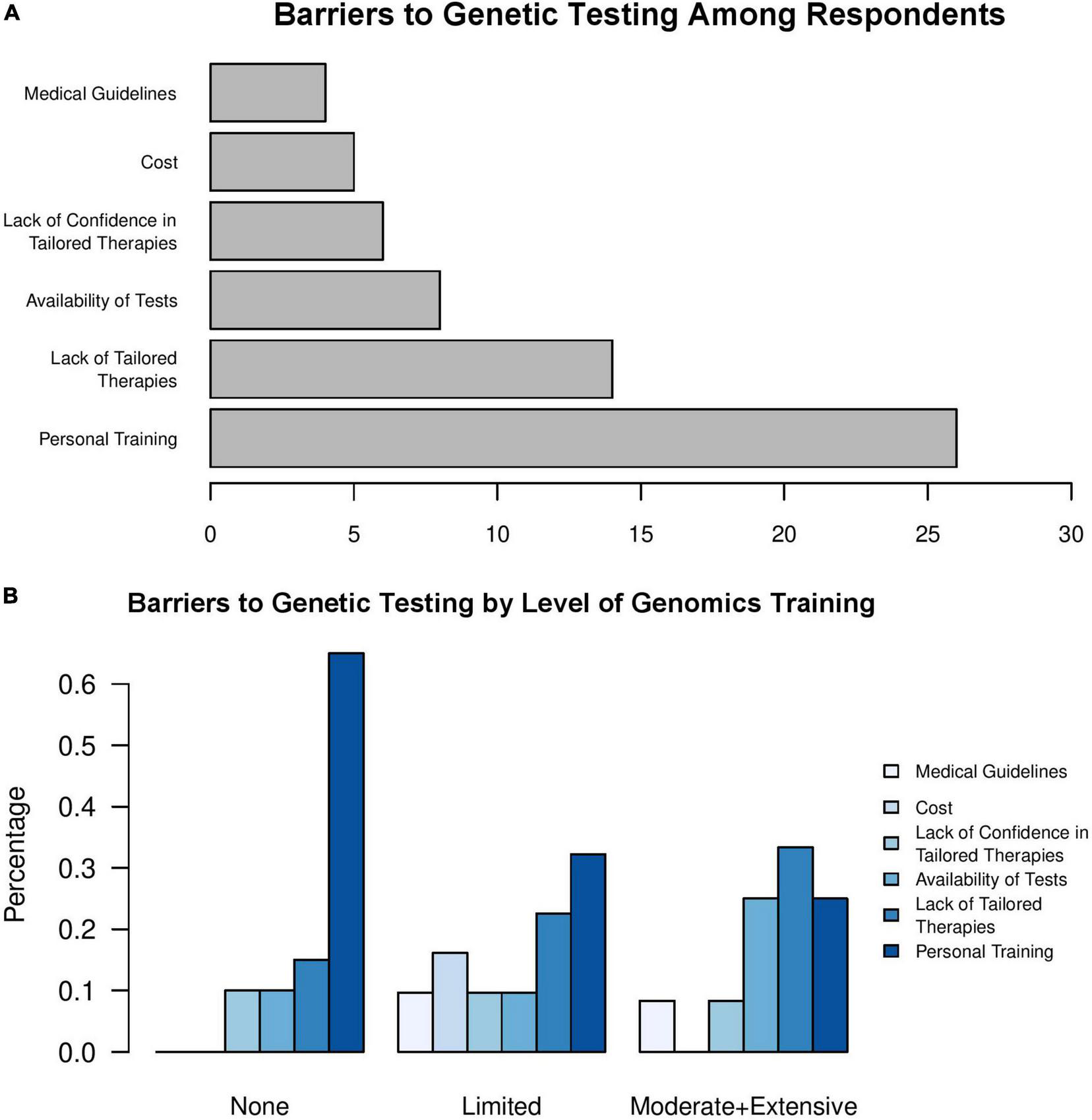Figure 2. Lack of personal training in genomics is a barrier to clinical genetic testing. Physician’s responses to the question, “What is the major barrier for you to order a genetic test for a given patient?” among (A) all respondents and (B) stratified by level of training in genomics.