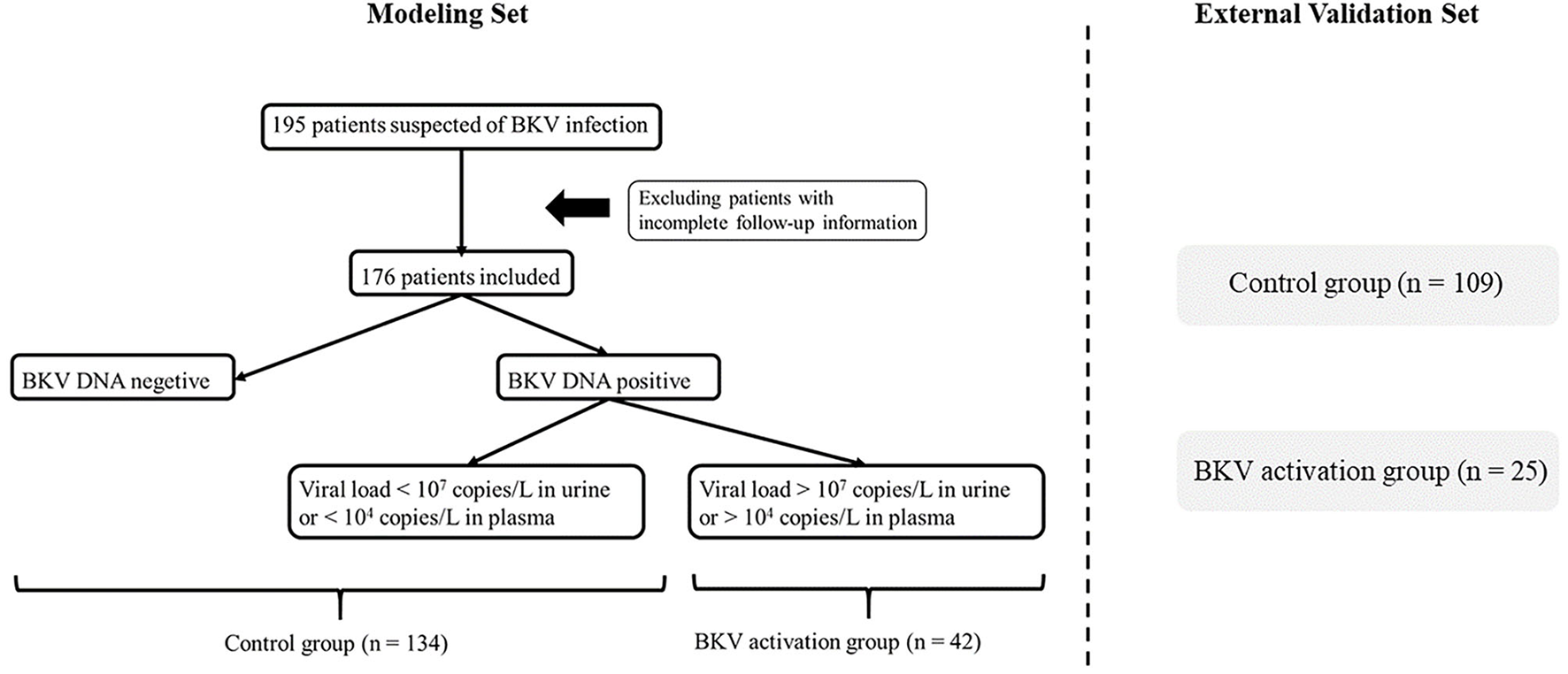 Figure 1. Flowchart of patient enrollment. After deleting invalid cases through the exclusion criteria, 176 patients were enrolled and divided into the BK virus (BKV) activation group (n = 42) and the control group (n = 134) according to BKV-DNA levels in plasma and urine.