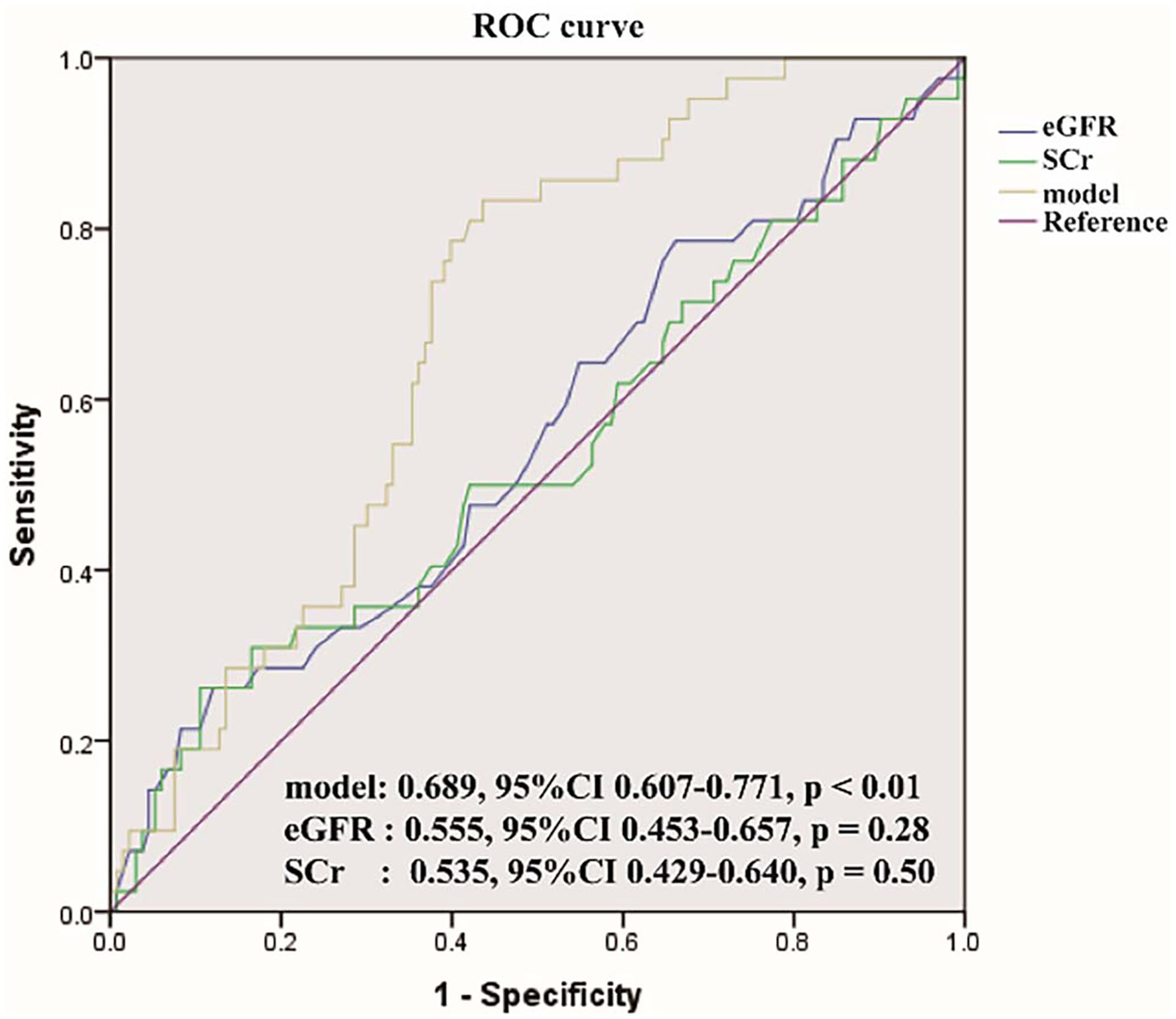 Figure 2. The receiver operating characteristic (ROC) curve of the model compared with serum creatinine (SCr) and estimated glomerular filtration rate (eGFR). The area under the ROC (AUROC) of the three models was 0.689, 0.555, 0.535, respectively, indicating that model has better predictive power.