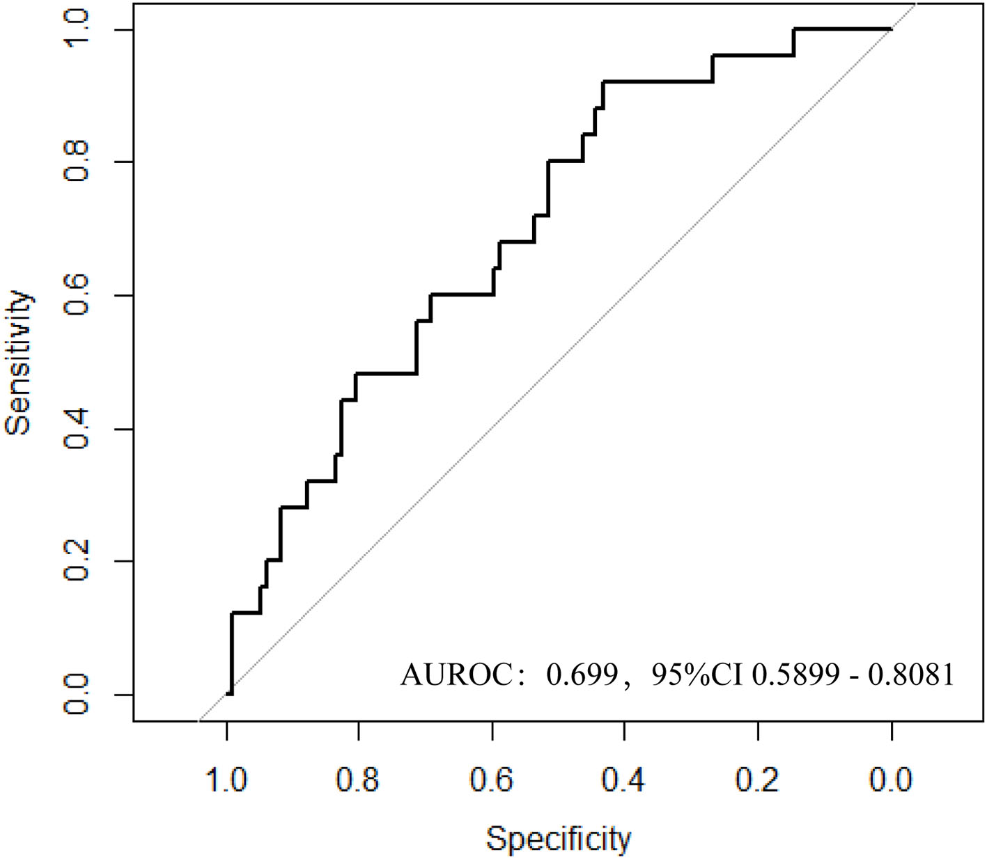 The logistic regression model [P/(1-P) = exp [0.745–1.347 (living donor)−0.691 (ln DB)−0.720 (ln Neutr)] displayed a good fit with a Nagelkerke R2 value of 0.143 and the nonsignificant Hosmer–Lemeshow test. The ROC analysis showed that the AUROC of the model was 0.689 (95% CI: 0.607–0.771; P < 0.01) for distinguishing the presence of BKV activation (Figure 2), which was better than the creatine or eGFR. To test the robustness of the model, we applied the model to the different age, sex, or eGFR subgroups and an independent cohort. Notably, the model demonstrated higher discriminability in female (AUROC, 0.721 vs. male 0.674) and younger patients (AUROC, 0.720 vs. male 0.664) (Figure 3), while its AUROC was roughly equal between the eGFR ≥ 45 ml/min/1.73 m2 and < 45 ml/min/1.73 m2 groups. Additionally, the model retained modest discrimination in the external validation dataset, although the AUROC slightly decreased (0.699, 95% CI: 0.5899–0.8081) (Figure 4).