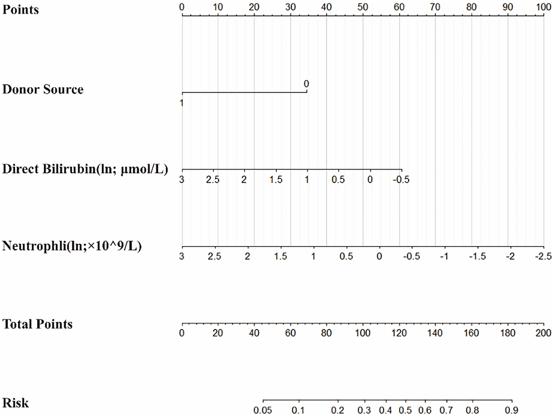 On the basis of the multivariate logistic regression model, a nomogram was constructed for predicting BKV activation (Figure 5). A total score was calculated using donor source, ln DB and ln Neutr. The value of each of these variables on the corresponding can match a number to a score on the point scale axis. A sum of all the variable scores could draw a line to the total point axis and acquire the probability of BKV activation.