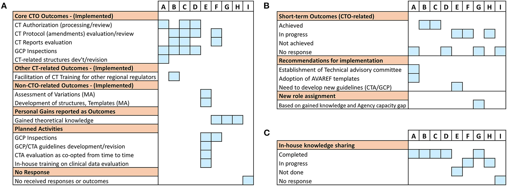 As a next step, we sought to assess the short-term outcomes of the training 3–4 months upon its completion using the predefined framework for mapping (Table 1). Here, we defined outcomes as a measure of deliverables in terms of qualitative and quantitative improvements in daily CTO-related routines of fellows as a result of the training received. As the cumulative analysis of data generated from a disparate cohort like this one consisting of participants with varying expectation profiles has a risk of clouting the representative picture in its truest sense, we resorted to analyzing the participants' outcomes on individual basis (Figure 2A). Similar to the pre-training expectations results, we observed two distinct clusters of responses from the trained fellows based on implementation status of the newly gained knowledge (i.e., achievement of CTO-related outcomes, Figure 2A). While one cluster (fellows A, B, C, and D) reported enhanced performance in CTO activities such as CTA review, CT protocol assessments, CT reports evaluation and GCP inspections, the other cluster (fellows E, F, G, and H) involved responses that only harped on personal theoretical gains in CT regulation, planned activities, and other non-CTO-related outcomes (Figure 2A). We also noted that supervisors' feedback in direct reference to the query on achievement of outcomes further affirmed the trained staff reported outcomes (Figure 2B). Whereas, no supervisor recounted achieved deliverables in the cluster of fellows who reported general knowledge gains, planned activities, or gains relevant to other regulatory functions, two responding supervisors of fellows in the other cluster confirmed enhanced performance in CTO activities (Figure 2B). Interestingly, we further observed that all trained fellows in the cluster that reported CTO-related outcomes had also performed an internal seminar for knowledge transfer contrary to only one fellow in the other cluster who reported a similar achievement (Figure 2C). Our findings not only highlighted a two-group differential achievement of training outcomes, but also revealed lapses in a clear communication of expected outcomes to beneficiaries of external trainings; a scheme that could be useful to ensure in-house sharing and retention of externally gained knowledge.