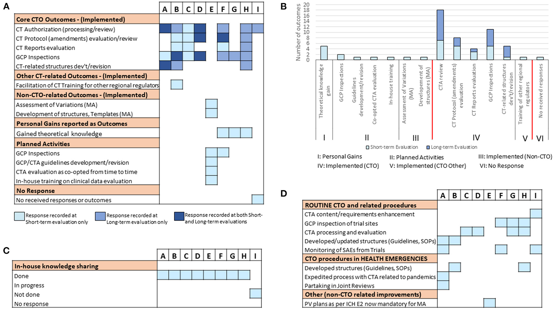 Long-term follow-up evaluation of fellows' outcomes and improvements of CTO activity at the NMRA level: Information was sought from fellows using an electronic survey on issues of individual-level achieved training outcomes and organizational-level improvements in CTO 15 months after the training. (A) Individual responses from all sponsored fellows showing the kind of outcomes (CTO-related, non-CTO-related, others) reported cumulatively (i.e., at short- and long-term evaluation time-points). (B) A comparative assessment of individual fellow responses (reported outcomes) at the short- and long-term evaluation time-points. (C) Individual responses from fellows on the status of knowledge sharing conducted as per NMRA guidelines. (D) Individual fellow responses on NMRA-level improvements in routine CTO activities and related procedures as well as CTO procedures in health emergencies.