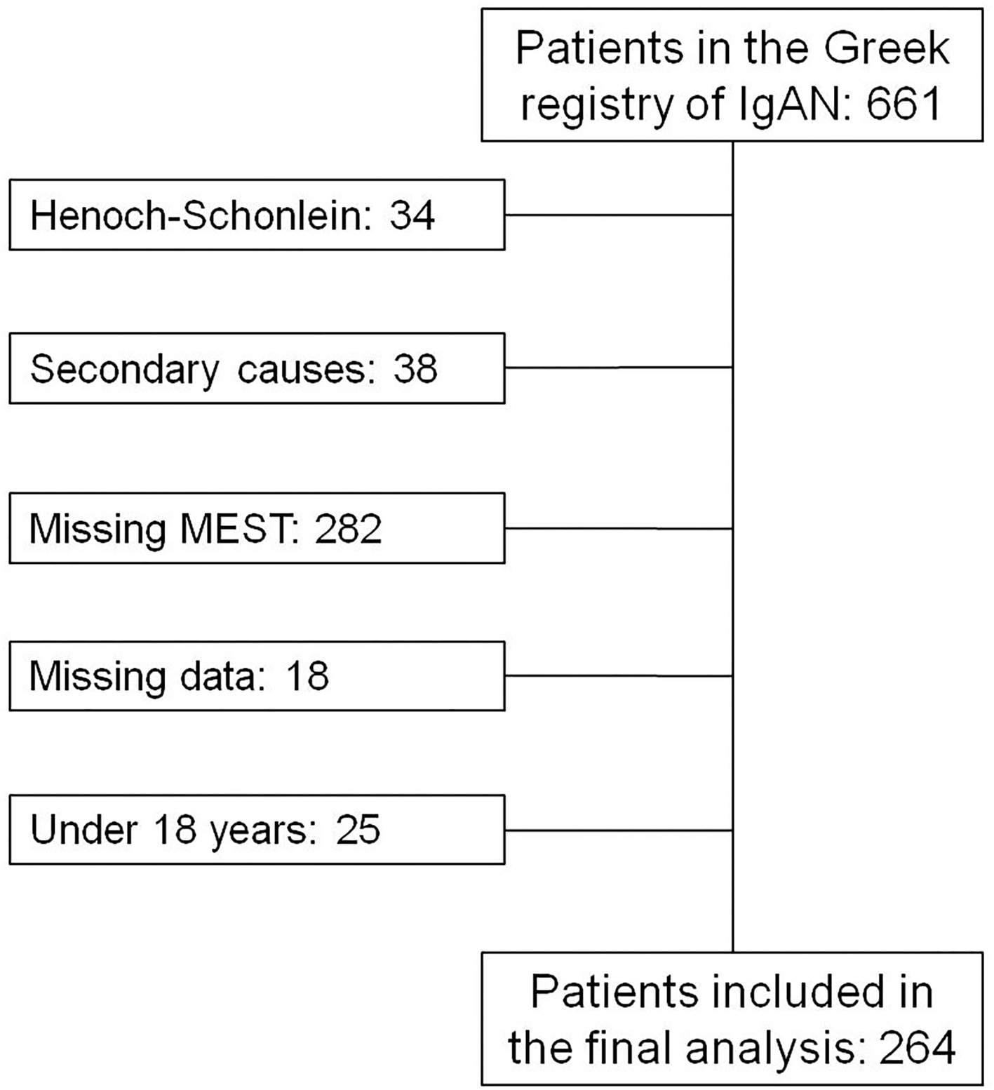 In this study, we included patients from the Greek Society of Nephrology IgAN registry (8). In this registry, patients with biopsy-proven IgAN are reported independently for research purposes from different nephrology departments across Greece. This cohort currently consists of 657 patients. Of these, only patients with available MEST scores and estimated glomerular filtration rate (eGFR) data with long-term follow-up after biopsy (over 1 year) were included in the final analysis. Furthermore, we included only those who were 18 years or older and who did not have established ESKD at the time of biopsy. This project was approved by the research ethics committee of the University Hospital of Patras, which waived patient's written informed consent for using their anonymized historical clinical data.
