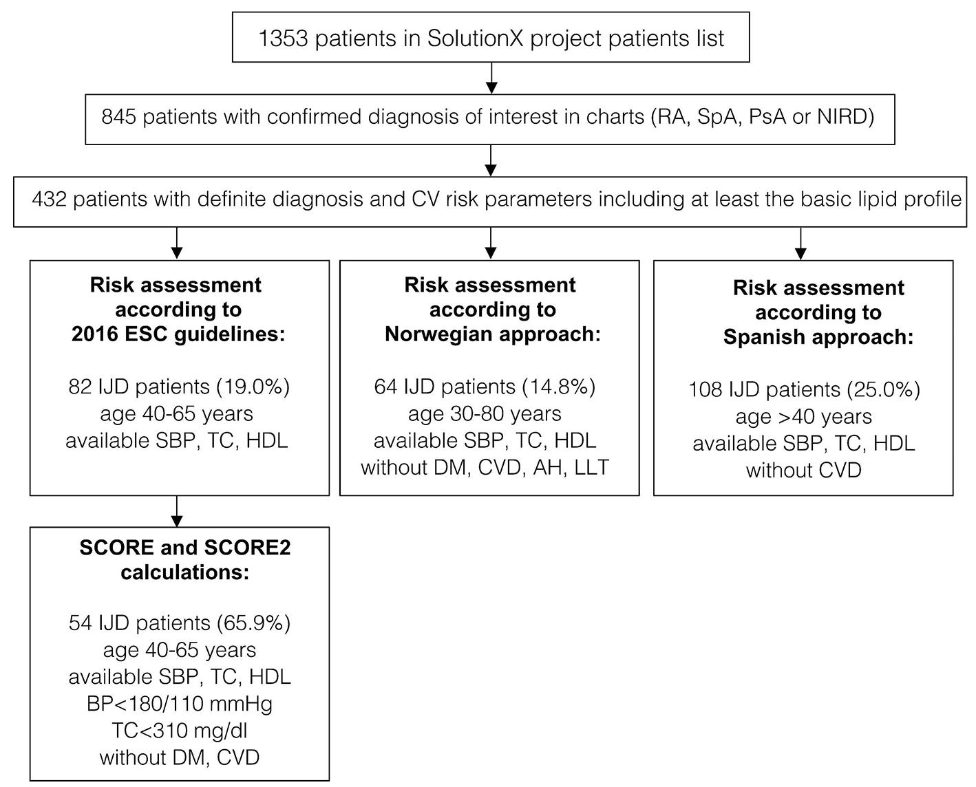 Figure 1. A flow chart of patients' selection and data availability for different analyses (original SCORE and SCORE 2 calculation, risk assessment according to 2016 ESC Guidelines, the Norwegian and the Spanish approaches). RA, rheumatoid arthritis; SpA, spondyloarthritis; PsA, psoriatic arthritis; IJD, inflammatory joint disease (aggregate of RA, SpA, and PsA); NIRD, non-inflammatory rheumatic disease; AH, arterial hypertension; CV, cardiovascular; CVD, cardiovascular disease; DM, diabetes mellitus; ESC, European Society of Cardiology; HDL, high density lipoprotein; LLT, lipid-lowering therapy; TC, total cholesterol; SBP, systolic blood pressure; BP, blood pressure.