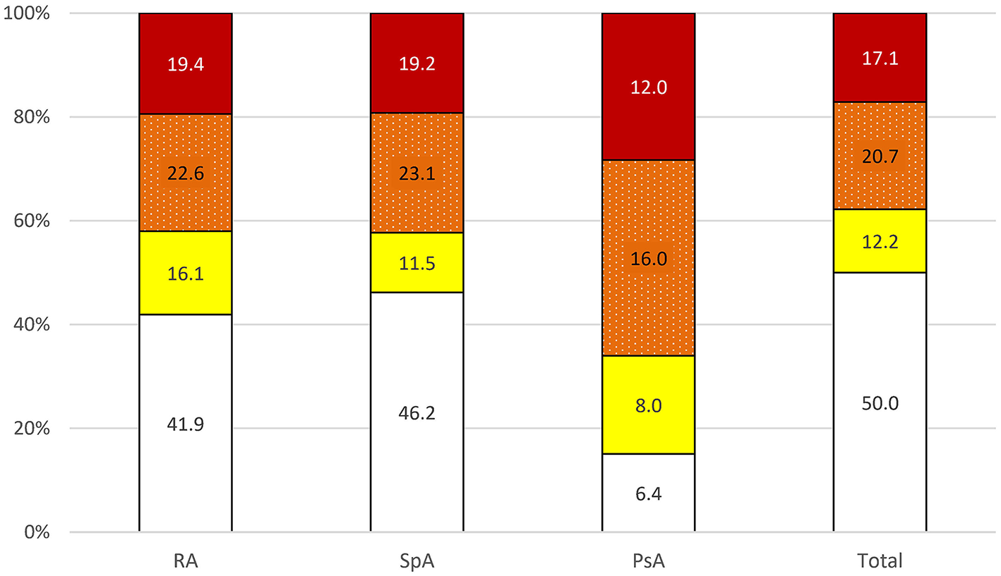 very high risk; data given in percentages). PsA, psoriatic arthritis; RA, rheumatoid arthritis; SpA, spondyloarthritis.