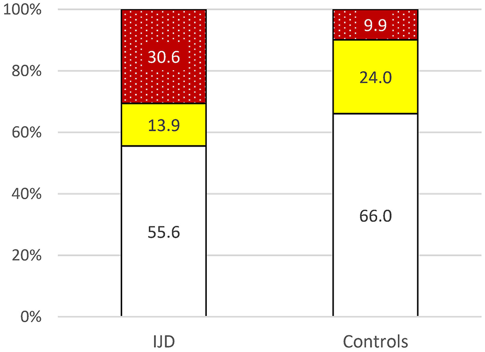 Data of the general population are available for Germany, although patients with established CV disease were excluded (21). The CV risk is higher in the IJD cohort than in the German general population as shown in Figure 3 (p = 0.004).