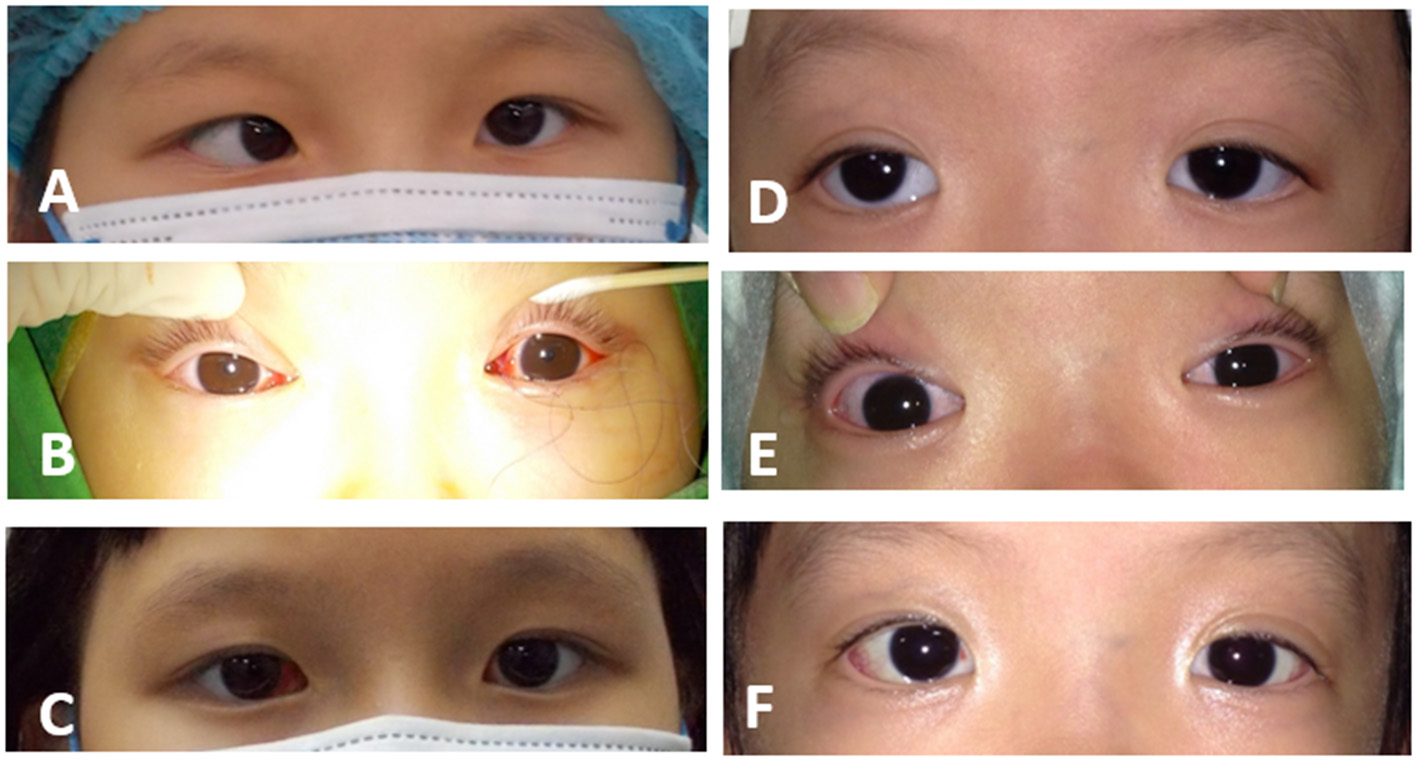 Perioperative photographs of patients who underwent the novel method. (A) A 6-year-old girl showed 45 PD esotropia before the operation. (B) Adjustment was performed intraoperatively with assistance of the corneal light reflex. (C) At the 1-week postoperative visit, the girl showed orthophoric results. (D) A 5-year-old girl presented with 45 PD exotropia before the operation. (E) The end point of adjustment was shown during strabismus surgery. (F) The girl showed orthophoria at her 1-week postoperative visit.