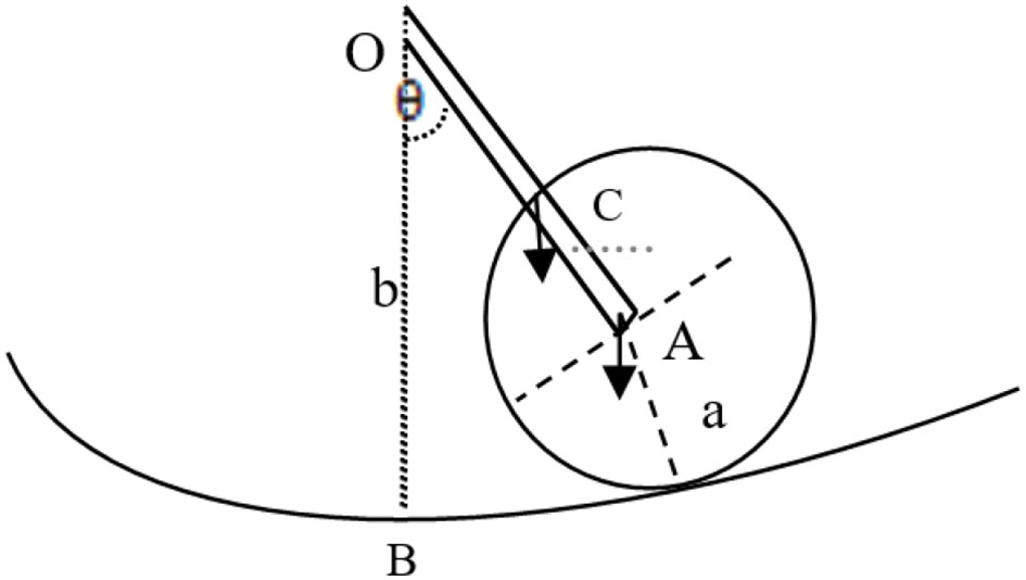 In essence, the vibrating string appears like the movement of a pendulum (40). The vibrating pendulum shown by Figure 4 includes a mass m1 connected with m2 with a straight rod and radius A. The other end of that rod is fixed in space and associated with the center O of a cylinder with radius B, where the rod length is l = b–a. Thus, the disk vibrates around point O. The equipment takes the point B as the standard potential energy V: