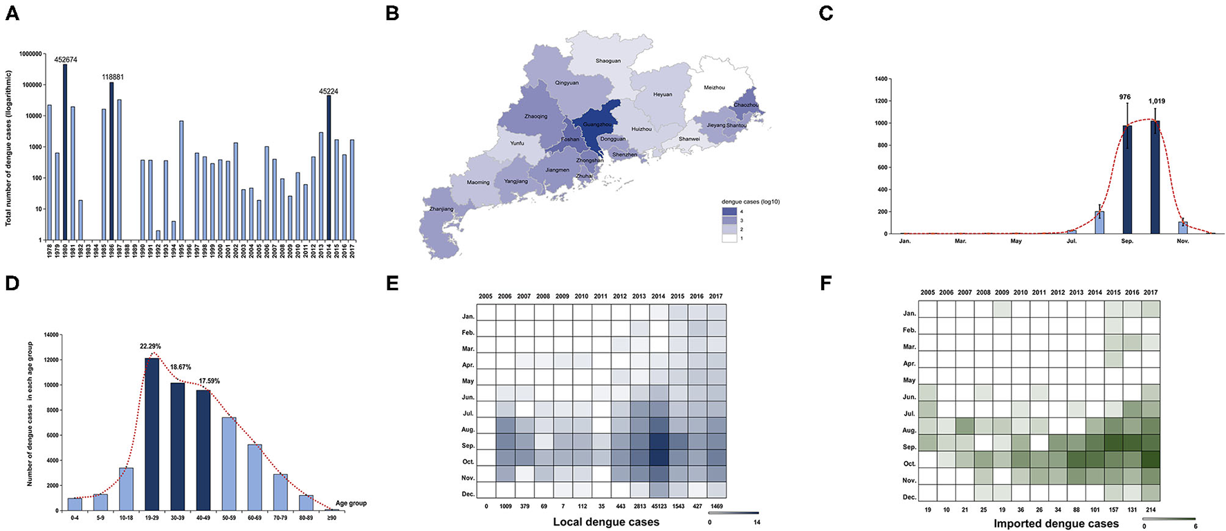 Epidemiology characteristics of dengue in Guangdong from 1978 to 2017. (A) Annual number of dengue cases in Guangdong from 1978 to 2017. The Y axis is displayed on the logarithmic scale (log10). Three major dengue epidemics are marked by dark blue. (B) Geographic distribution of accumulated dengue cases from 1990 to 2017 in 21 cities of Guangdong. The number of dengue cases in each city is displayed by colors of shades according to logarithmic form (log10). (C) Seasonal distribution of dengue in Guangdong from 1990 to 2017. The number of cases in each month is presented by the average number within the last 28 years. The incidence peak is shaded according to logarithmic scale (log10). (D) The age distribution is presented by accumulated dengue cases from 2005 to 2017 in each age group. The more affected groups are marked by dark blue. (E,F) The number of local and imported cases each month is shaded according to the logarithmic scale (log2).