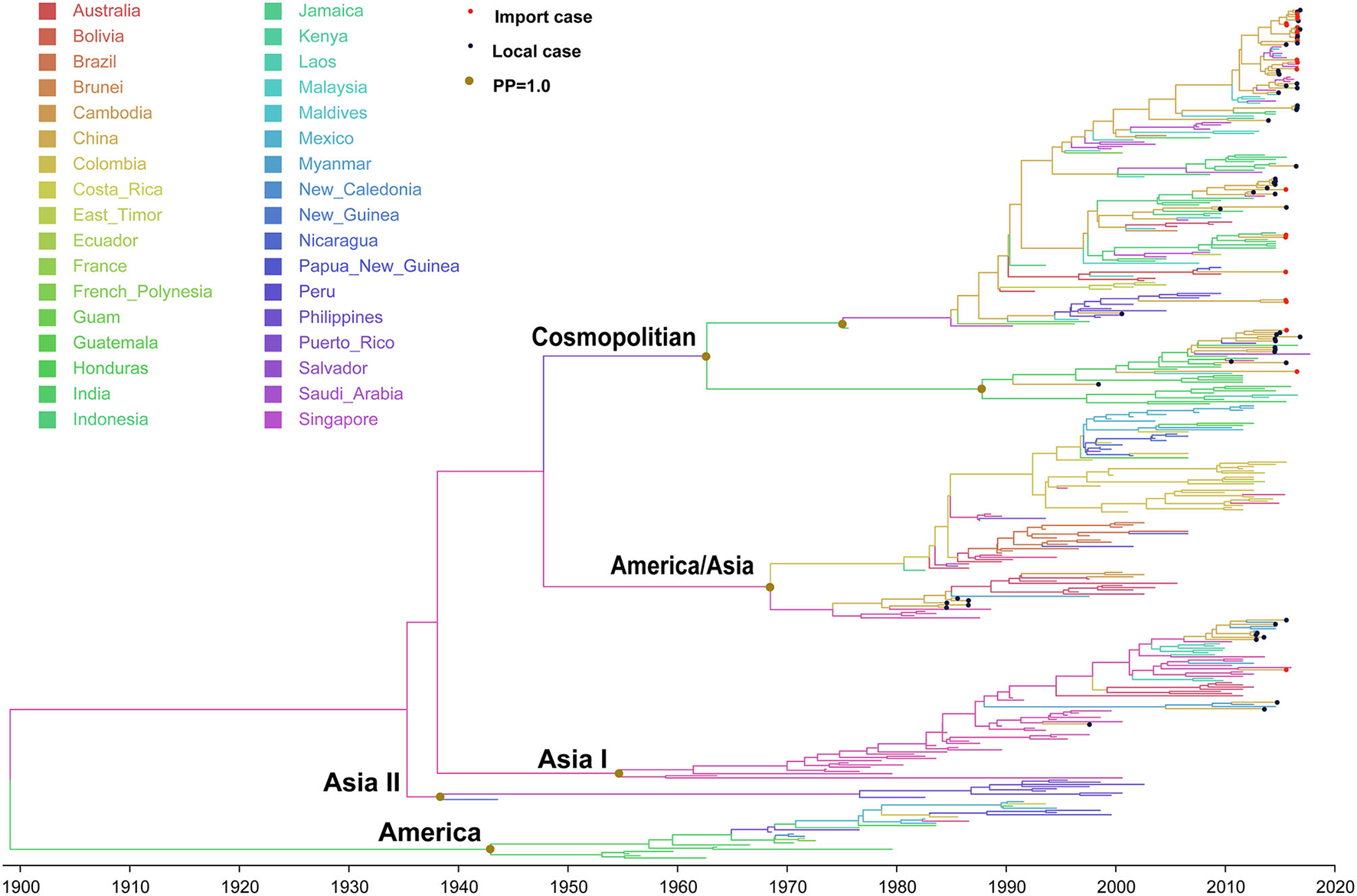 Bayesian evolutionary tree of DENV 1. Source countries/regions of each strain and different genotypes of DENV 1 are presented by colors. Red dots represent imported cases, blue dots represent local cases, and brown dots are internal branch points with posterior probability = 1.0.