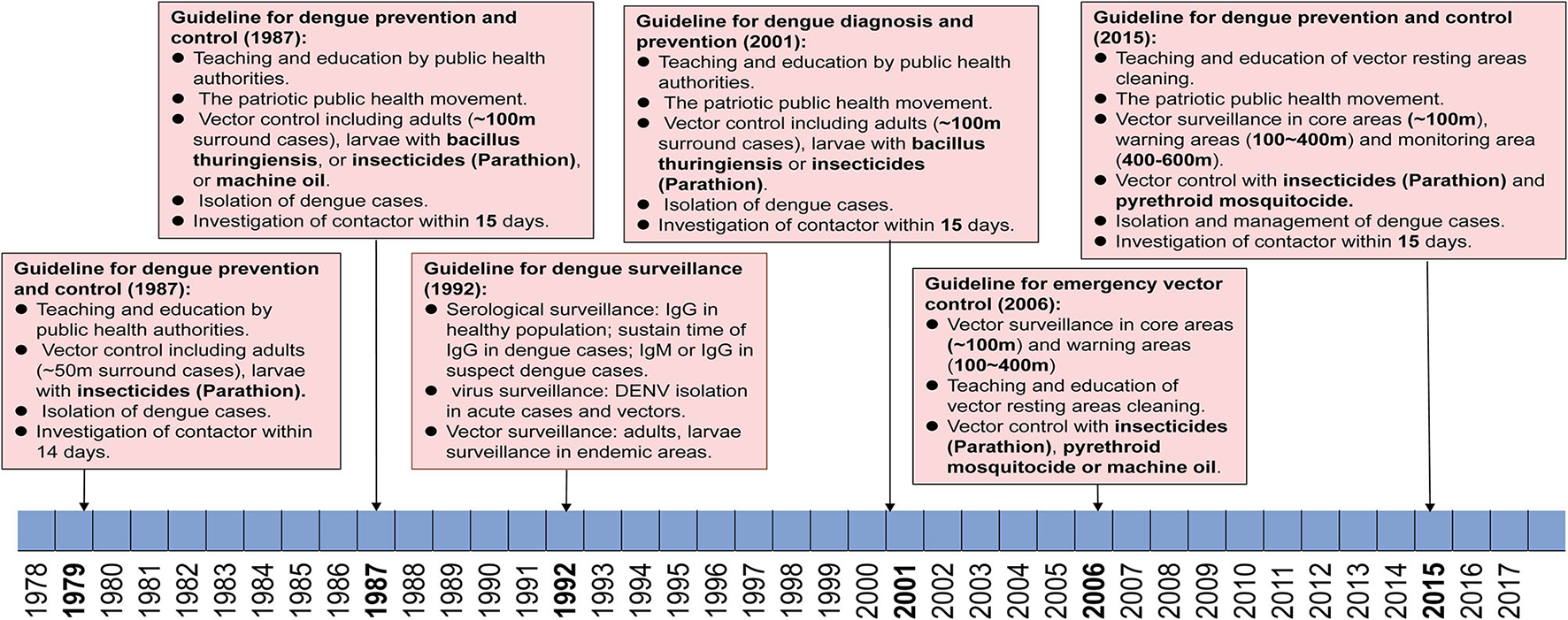 There were three versions of guidelines for dengue prevention and control published formally by the Guangdong provincial public health authorities in 1979, 1987, and 2015 (Figure 5). During this period, dengue was first considered as a notifiable infectious disease, leading to the initiation of case and vector surveillance in Guangdong province in 1992. An emergency vectors surveillance guideline was launched in Guangdong regarding the dengue outbreak in 2006. Meanwhile, national criteria for dengue diagnosis and prevention were issued in 1988, 2001, and 2008 by the Chinese Ministry of Health.