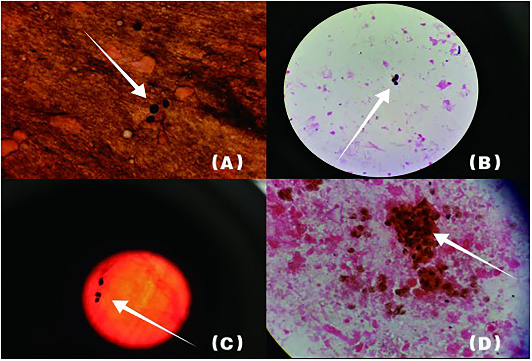 Arrowheads show P. jirovecii cysts which are round or oral. The cyst wall is darkened or brownish-black by GMS, while the content is almost colorless. (B) shows lung tissue specimen, (A,C,D) are BALF specimens.