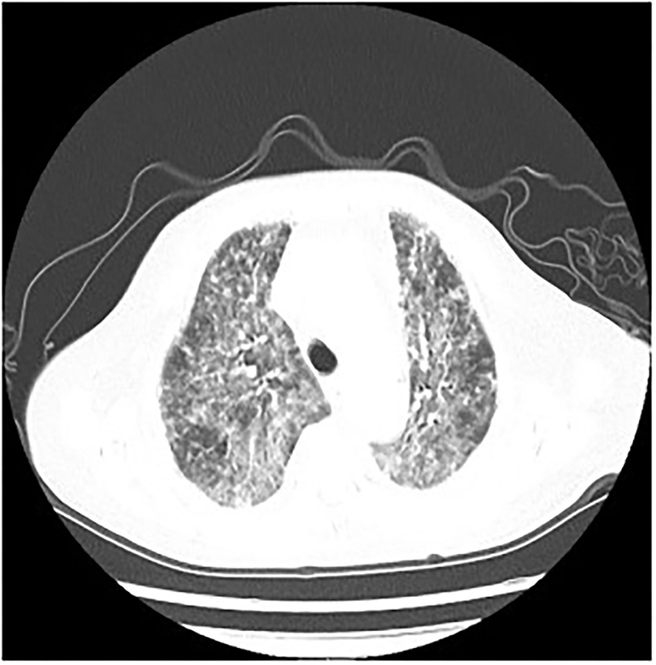 The following abnormal laboratory test results were obtained: white blood cell count, 2.5 × 109 cells/L; red blood cell count, 2.38 × 1012 cells/L; hemoglobin, 85 g/L; lactate dehydrogenase, 429 U/L; procalcitonin, 0.117 ng/ml; C-reactive protein, 7.27 mg/L; erythrocyte sedimentation rate, 34 mm/h; Interleukin 6, 35.7 pg/ml; Interleukin 10, 44.57 pg/ml; KL-6, 933 U/ml; Coxsackie virus, EB virus, measles virus, and cytomegalovirus IgG positive; EB virus and cytomegalovirus IgM positive; percentage of total T lymphocytes, 90.71%; Absolute number of helper/inducible T lymphocytes, 33/ul; chest radiograph, multiple large flaps of exudate in both lungs.